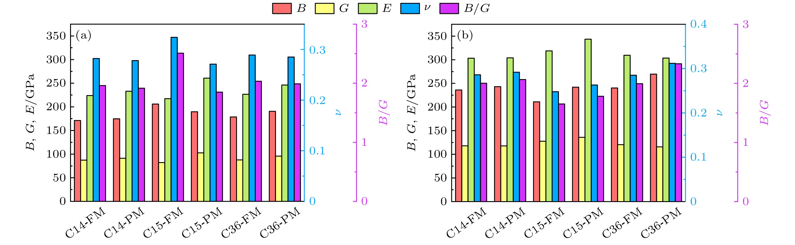 弹性常数c11c33分别反映了a轴和c轴对单向压缩的阻力, c44c66分别代表(100)和(001)抗剪切变形的平面阻力[37]. 对于Co2Hf的C14结构、顺磁态的C36结构, 及铁磁Co2Ta的C14和C36结构, c11 < c33, 表明这些结构在c 轴上抗击压缩的能力比a轴强. 对于FM Co2Hf的C36结构、PM Co2Ta的C14结构, c11 > c33, 表示这些结构在a 轴上抗击压缩的能力比c轴强. Co2Hf的C36结构和Co2Ta的C14结构, 考虑自旋极化对a轴和c轴对单向压缩的阻力有一定的影响. 利用Voigt-Reuss-Hill平均方法, 计算了体模量B、剪切模量G、杨氏模量E和泊松比ν, 结果如图4所示. 通常用B/G[38]和泊松比$ {\mathrm{\nu }} $[39]区分固体的延脆性, 关键参数B/G = 1.75 ($ \nu $= 0.33). 如图4所示, 所有结构的B/G值都略大于1.75, 而$ \nu $值接近0.3, 说明Co2Hf和Co2Ta Laves相具有本征脆性.