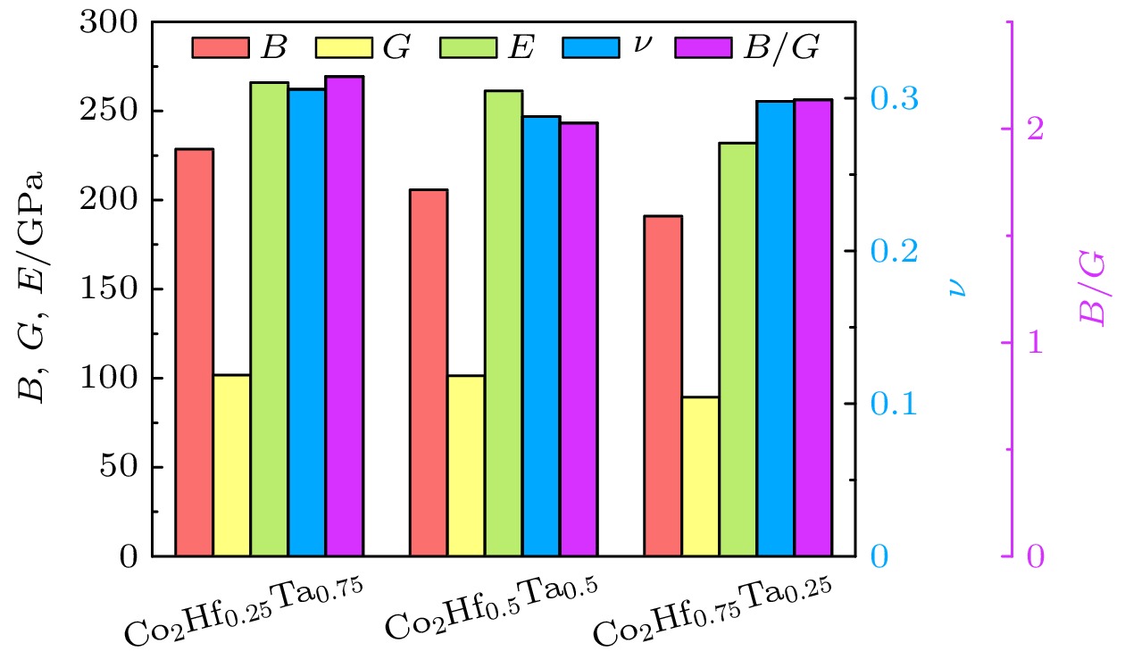 Figure 5.  Elastic modulus, Poisson’s ratio ($ \nu $) and B/G values of Co2(Hf Ta) alloys.