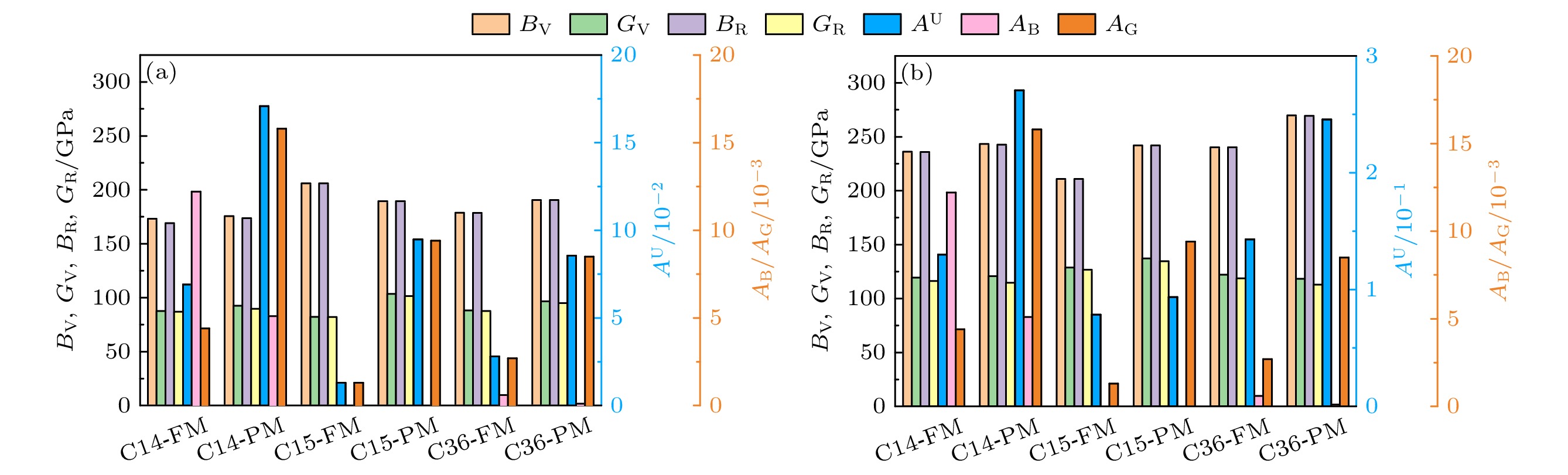 图 6  Co2Hf (a)和Co2Ta (b) 的弹性模量和各向异性因子AU, ABAG