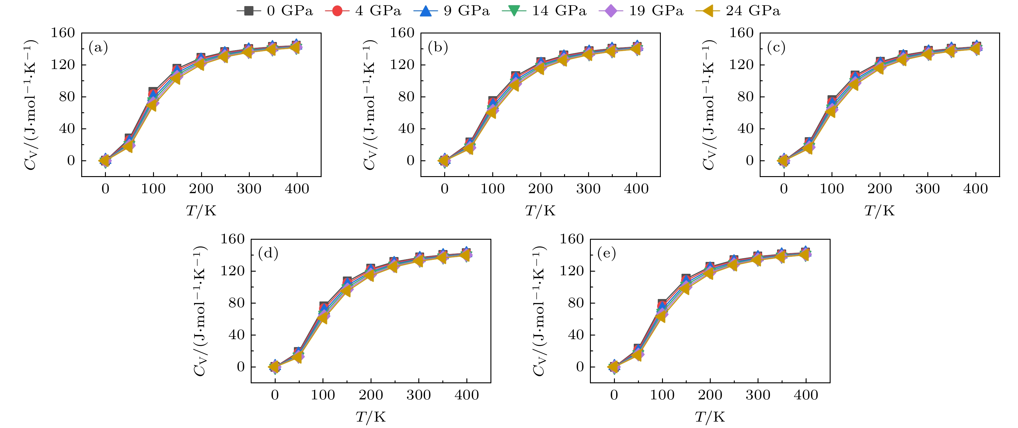• 正如前文讨论, 在顺磁态下, 钴的局域磁矩趋近于零. 表明在高温下, 计算考虑非自旋极化是合理的. 因此, 下面所计算的高温下的热力学性质均采用了无自旋极化的结构. 在此之前, 通过计算得出Co2Hf具有稳定的顺磁C15结构, 而Co2Ta和Co2(Ta1–xHfx) (x = 0.25, 0.50, 0.75)具有顺磁态的C36结构. 在准简谐近似下, 计算的热容CV图8所示, 同时也展示了热容随压强(0—24 GPa)的变化. 在温度T< 200 K时, CV增长迅速, 随着温度升高 (T > 200 K), CV增大变缓慢. 在高温时, CV逐渐收敛于一个特定值的倾向, 即热容的极值, 对应于杜隆-珀替定律常数.