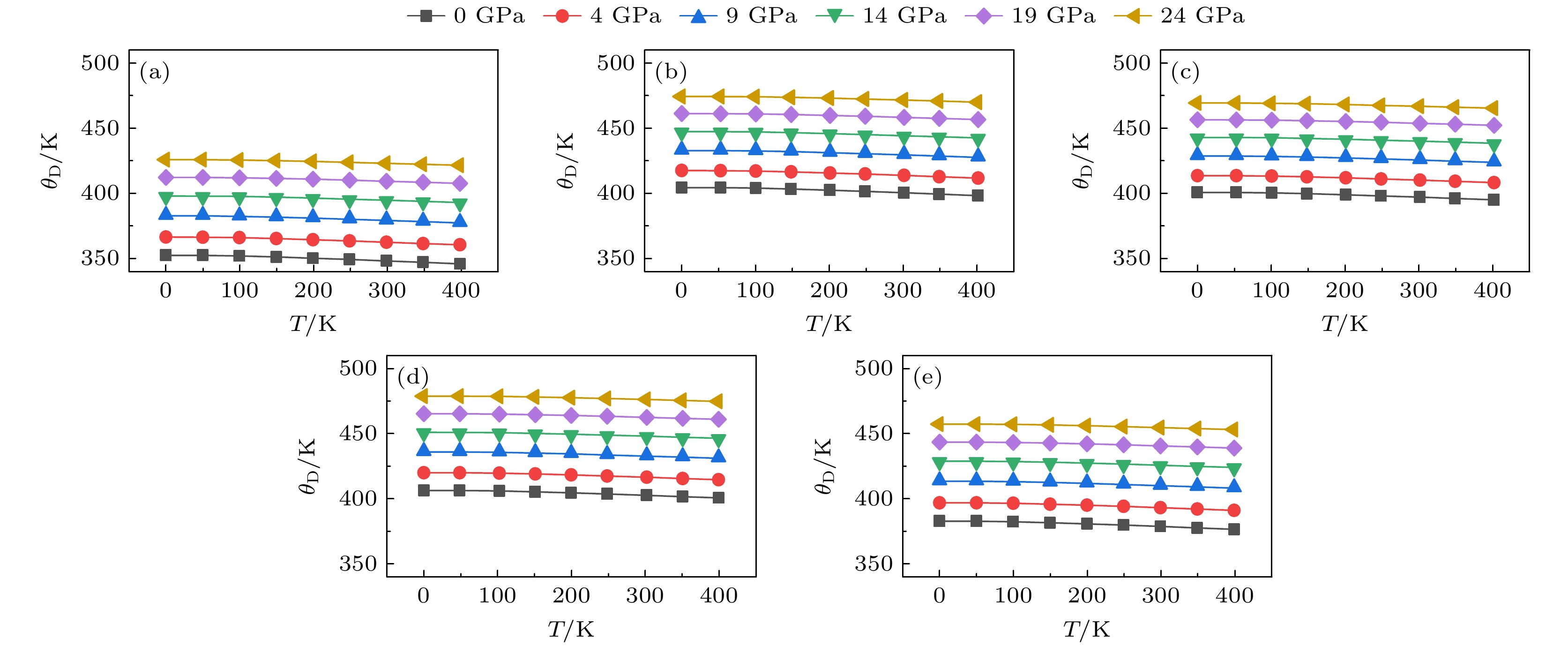 图9展示了德拜温度($ {\theta }_{{\mathrm{D}}} $)随温度和压强的变化关系. 从图9可看出, $ {\theta }_{{\mathrm{D}}} $在温度范围0—400 K时近似为常数. 当温度一定时, $ {\theta }_{{\mathrm{D}}} $随着压强的增大而增大. 在零温零压下, C15 Co2Hf的$ {\theta }_{{\mathrm{D}}} $为352.5 K, C36相Co2Ta的$ {\theta }_{{\mathrm{D}}} $为404.48 K, Co2Hf0.25Ta0.75$ {\theta }_{{\mathrm{D}}} $为400.77 K, Co2Hf0.5Ta0.5$ {\theta }_{{\mathrm{D}}} $为406.39 K, Co2Hf0.75Ta0.25$ {\theta }_{{\mathrm{D}}} $为382.82 K, 因此, Hf的加入可能对Co2Hf Ta合金德拜温度的变化产生影响.