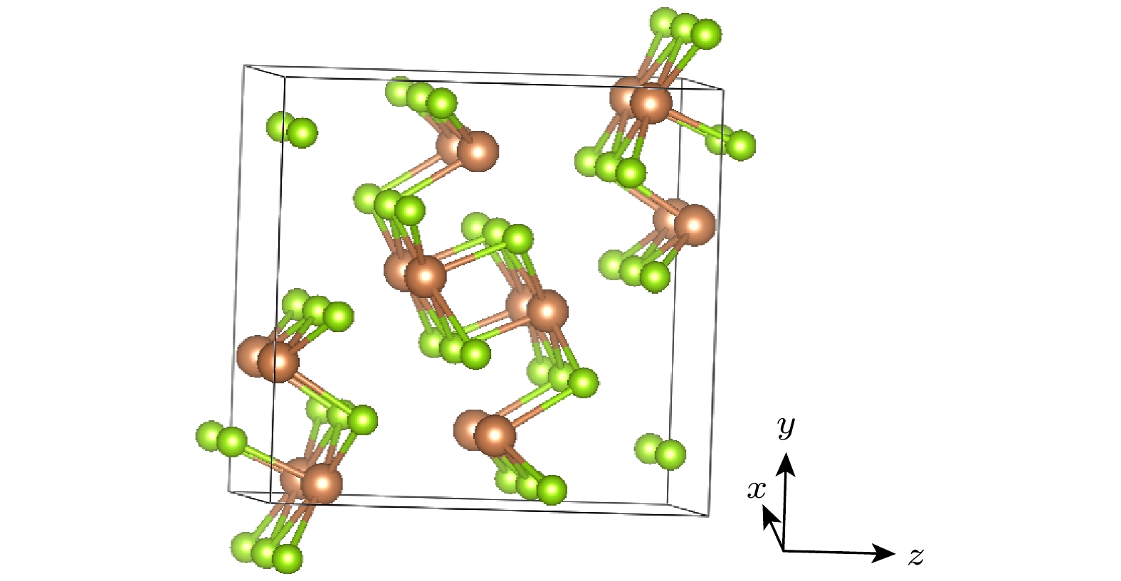 本研究采用VASP (Vienna ab initio simulation package)中的第一性原理计算方法进行探究, 通过平面波基组展开电子波函数, 使用广义梯度近似(GGA)下的PBE交换泛函来描述电子与电子之间的交换关联作用[13]. 为确保计算的准确性, 进行了收敛性测试. 选择平面波截断能量400 eV, 使用4×3×3的k空间取样密度, 能保证总能量的收敛性. 迭代过程中, 收敛精度选择1×10–6 eV/atom. 在布里渊区中, 选取了如下特殊K点[14], 分别是G(0, 0, 0), X(0.5, 0, 0), Z(0, 0, 0.5), U(0.5, 0, 0.5), Y(0, 0.5, 0), S(0.5, 0.5, 0), T(0, 0.5, 0.5), R(0.5, 0.5, 0.5), 能带结构中的布里渊区路径为G-X-Z-U-Y-S-T-R. 研究的超胞模型结构如图1所示, 共40个原子, 其中包括24个硒原子和16个锑原子.