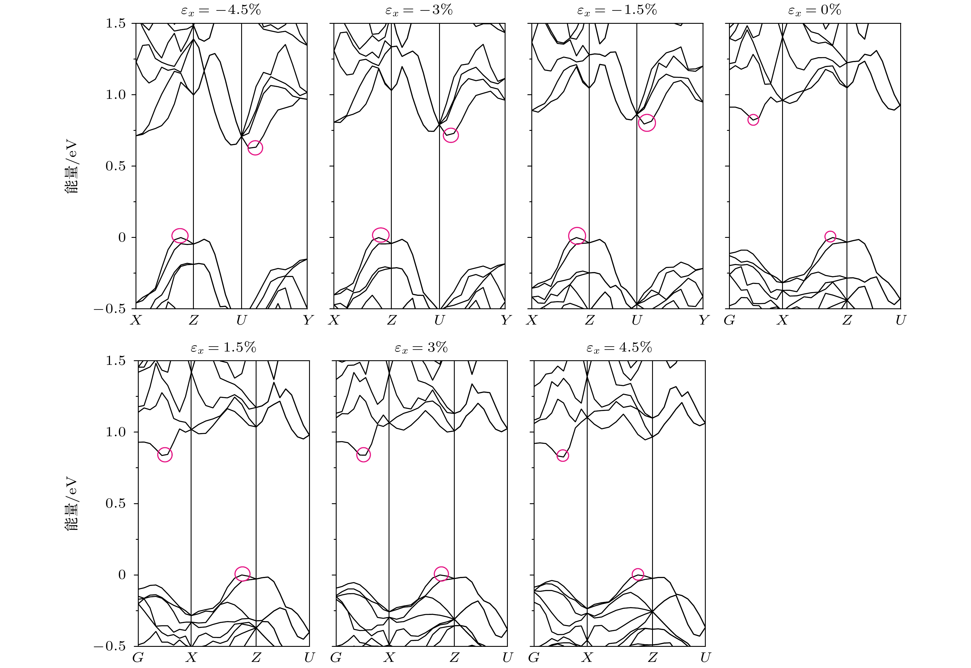 结合有效质量计算器(EMC)[23], 采用有限差分法(而不是能带抛物线拟合法), 我们计算了价带顶处的有效质量, 表1展示了不同应变方向及应变量下沿着x, y, z方向的有效质量. 可以看出, 无应变条件下, 空穴沿着x, y, z方向的有效质量分别为0.44m0, 0.94m0, 1.12m0, 与Zhang等[24]所计算的0.53m0, 0.42m0, 0.83m0及Wang等[22]所计算的0.85m0, 0.55m0, 3m0对比可以看出, 3组数据均在z方向上有效质量较大, 传输性能最弱; 此外, 本文计算的