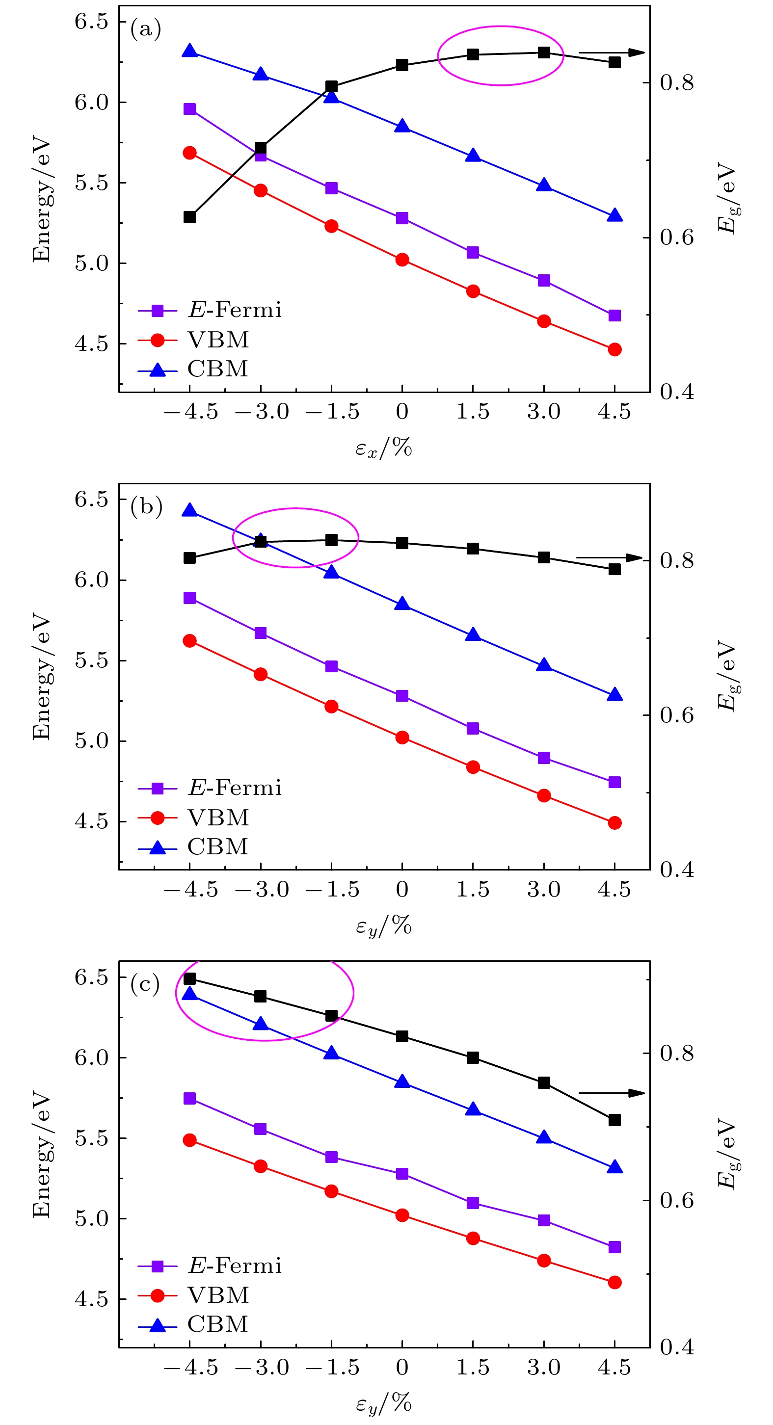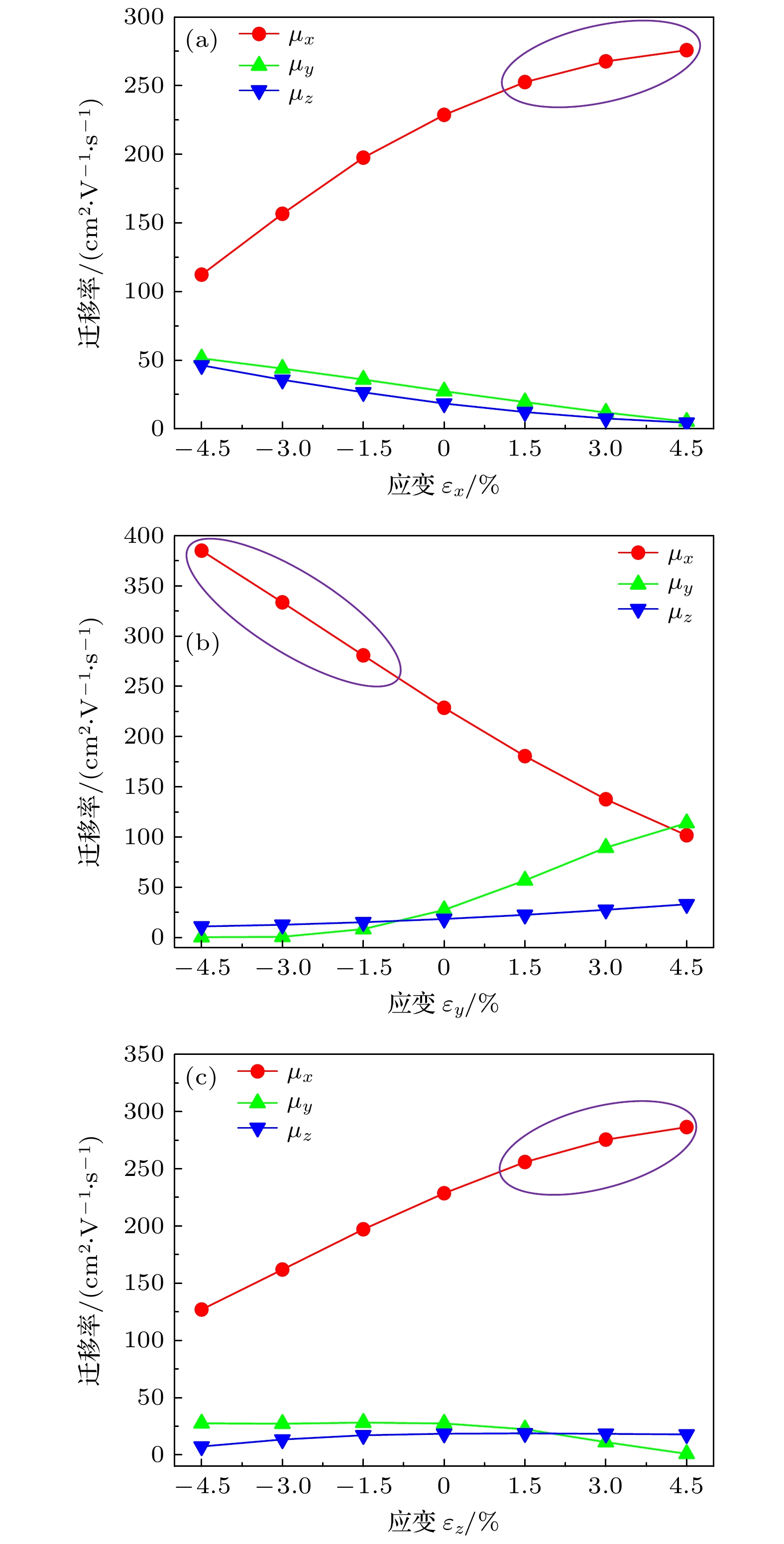 $ {m}_{x}^{*} $ 逐渐减小, μx逐渐增大;$ {m}_{y}^{*} $ 和$ {m}_{z}^{*} $ 逐渐增大, μy和μz逐渐减小; 当应变方向沿y方向, 随着应变量的增大,$ {m}_{x}^{*} $ 逐渐增大, μx逐渐减小;$ {m}_{y}^{*} $ 和$ {m}_{z}^{*} $ 逐渐减小, 而μy和μz逐渐增大; 当应变方向沿z方向, 随着应变量的增大,$ {m}_{x}^{*} $ 逐渐减小, μx逐渐增大;$ {m}_{y}^{*} $ 先基本维持不变, 再逐渐增大,$ {m}_{z}^{*} $ 先逐渐减小, 再基本维持不变. 这部分应变对m*的影响与上部分等能面提供的信息基本一致, 表明本计算方法基本可靠.从图6还可以看出, 当应变沿着x, z方向的时候, 拉应变可以获得更高的μx (如紫框所示). 当应变方向沿着y方向的时候, 压应变可以获得更高的μx. 结合应变对带隙的影响, z方向的拉应力会使带隙变小, 不利于最大限度地吸收光子, 不宜于提升太阳电池的光电转化性能. 对比应变沿着x, y方向上迁移率的具体数值, 考虑应变对带隙的影响, 发现当应变为εy = –3.0%时, μx达到本计算的最大值333.6 cm2/(V·s).
