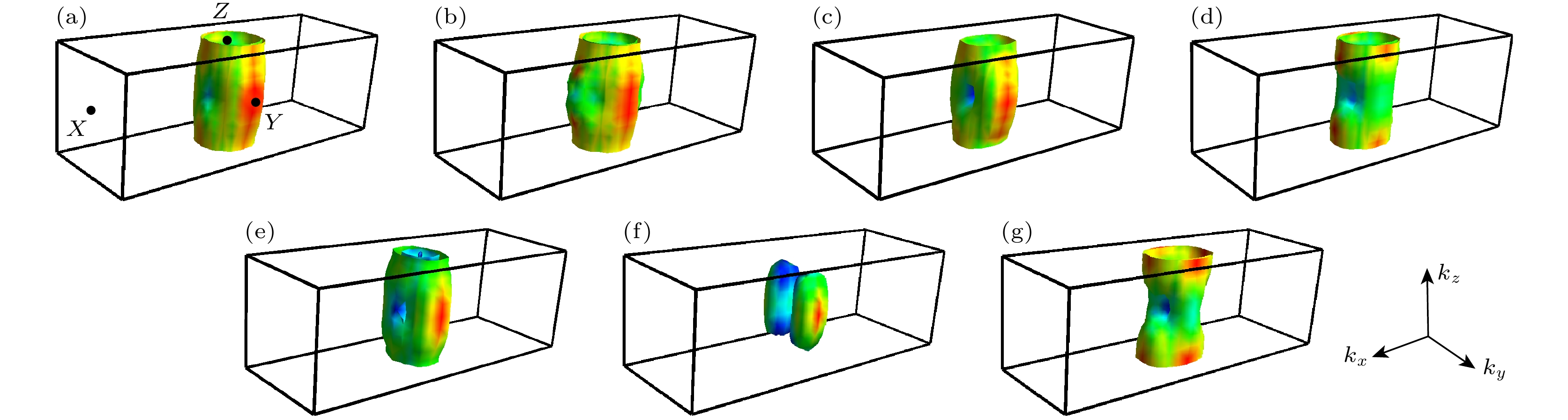 图 4 Sb2Se3价带顶下100 meV处的等能面的变化. 应变沿着x方向上 (a) εx = 0, (b) εx = –4.5%, (c) εx = +4.5%; 应变沿y方向上 (d) εy = –4.5%, (e) εy = +4.5%; 应变沿z方向上 (f) εz = –4.5%, (g) εz = +4.5%