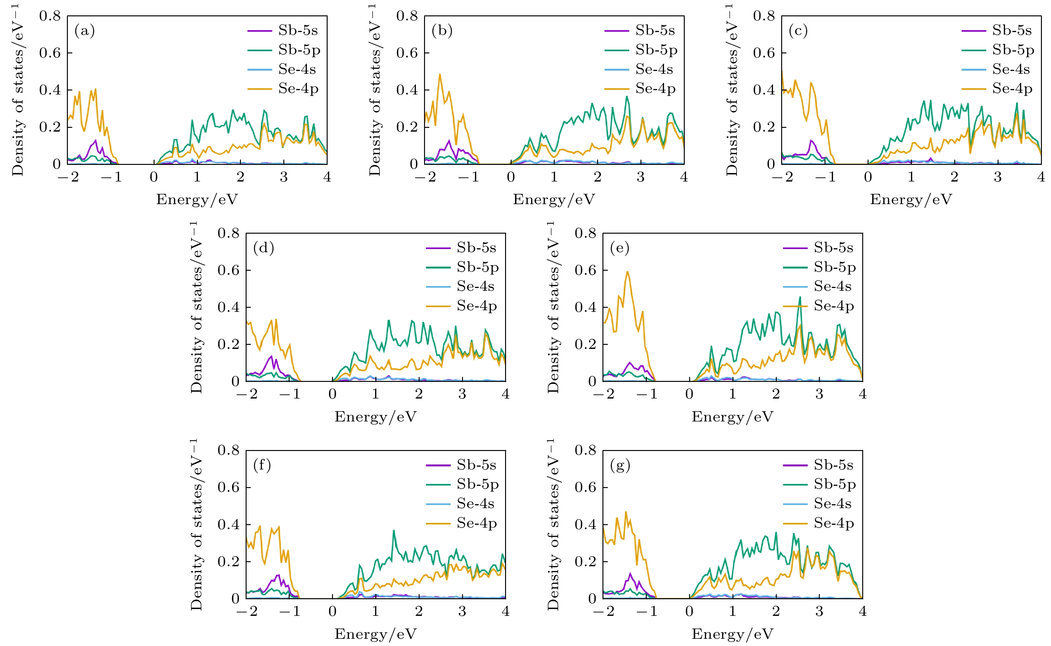 图 5 Sb2Se3分态密度图. 应变沿着x方向上 (a) εx = 0, (b) εx = –4.5%, (c) εx = +4.5%; 应变沿y方向上 (d) εy = –4.5%, (e) εy = +4.5%; 应变沿z方向上 (f) εz = –4.5%, (g) εz = +4.5%