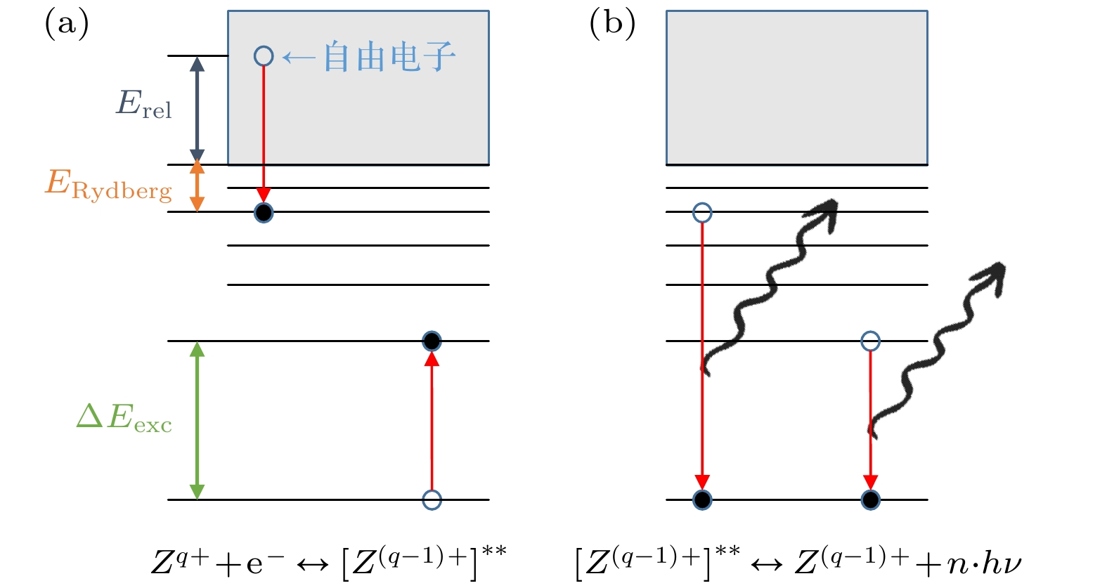 $ {Z}^{q+} $ 离子的双电子复合过程示意 (a) 第一步共振过程, 离子在俘获一个自由电子的同时将一个内壳层电子激发, 从而形成自电离态$ {{[Z}^{(q-1)+}]}^{{\mathrm{*}}{\mathrm{*}}} $ ; (b) 第二步过程, 自电离态离子通过辐射光子从而退激发到稳定态Figure 1. Schematic of DR of