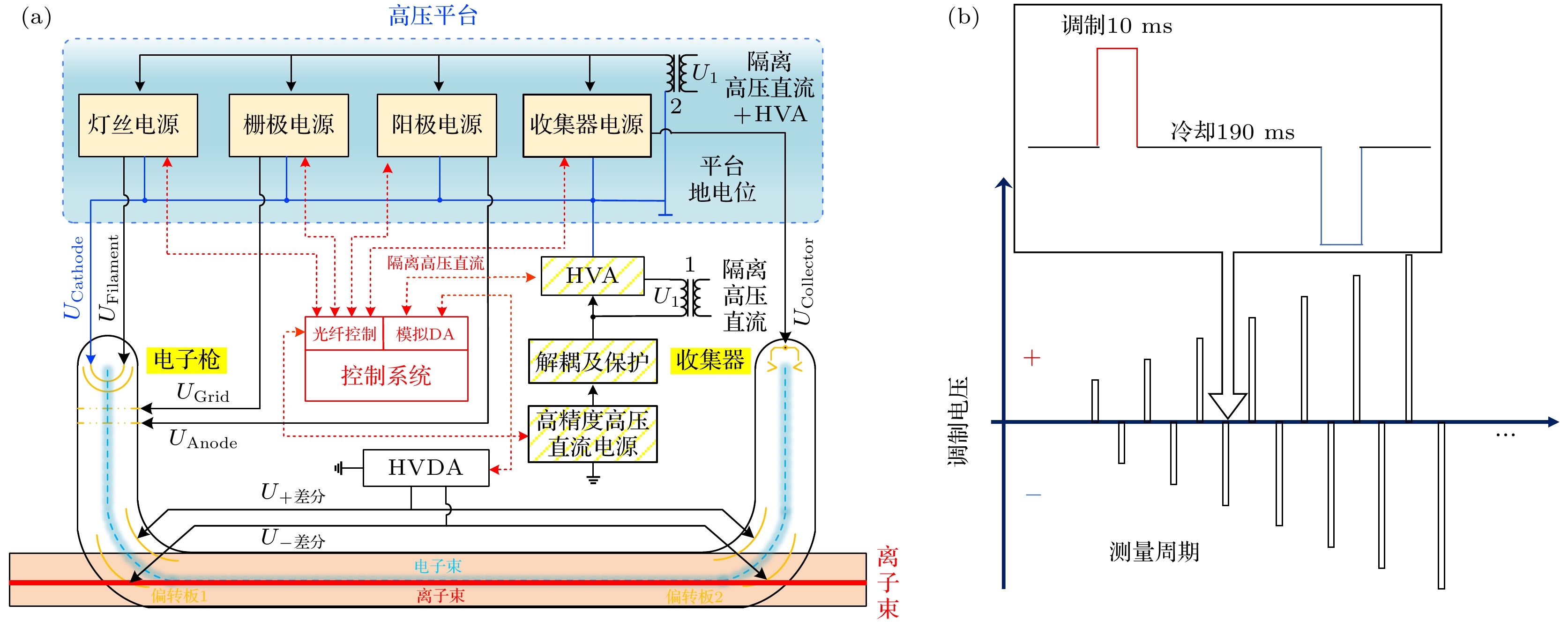 在储存环DR实验中, 通过电子束能量调制系统调节电子束能量, 可以得到非零的电子-离子碰撞能量. 为了在更高的束流能量下开展双电子复合实验, CSRe上的电子冷却器安装了最新自主研制的电子束能量调制系统, 可以输出300 kV的电压, 相对于冷却点的电子束电压调制范围为–15—15 kV, 对应质心系下的电子-离子碰撞能量调制范围为0—1 keV. 与CSRm的能量调制系统组成模块相似[24], CSRe能量调制系统中的高压电源系统由10个电压模块串联组成, 每一模块都有一个可以精确控制的电压源. 此外, 系统还附有专门的电压调制电路, 可以在500 μs内, 以总电压最大值10%的幅度快速调制电子束的能量. 在能量调制时, 考虑到高压电源系统的峰值电流为300 mA, 在每个模块内部安装了特殊的高压放大器来提供10 kW的功率, 整个调制系统可以提供100 kW的调制功率, 从而获得300 kV的高压. 10个受控模块的结构都相同, 其中电源部分由一个可以输出0—30 kV电压的接地高压模块与一个高压放大器串联而成, 高压模块与高压放大器分别由辅助电源和±6 kV的电源供电[25], 电子束能量调制系统示意图见图3(a). 需要注意的是, 在调制电压作用一定时间后, 由于电子束对于离子束的库仑冷却力会使得离子束的速度朝着调制电子束的速度偏移, 因此在能量调制10 ms后, 会让电子束维持在冷却能量190 ms以维持离子束的能量稳定, 之后再进行电子束能量调制, 实验中的能量调制时序如图3(b)所示.