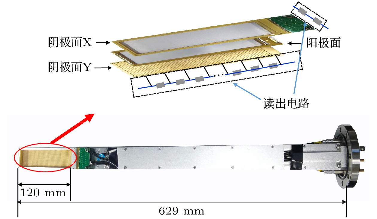 本文主要是利用MWPC探测器开展实验, 在DR实验中使用的MWPC探测器结构如图4所示, 阳极面由20根水平的、直径为20 μm的镀金钨丝组成, 彼此间距2 mm; Y层阴极面则是由80根水平的、直径为20 μm的镀金钨丝组成, 丝的间距为0.5 mm; 至于X层阴极平面, 使用了1.8 mm宽的印刷电路板取代纵向丝, 不仅解决了纵向丝固定的问题, 同时还可以将延迟读出模块嵌入背面以节省空间, 印刷电路板间隔0.2 mm, 共60条. 阳极和两个阴极平面的距离均为4 mm, 工作气体由80%的氩气和20%的二氧化碳气体混合而成, 气体流量为1.60 L/h.