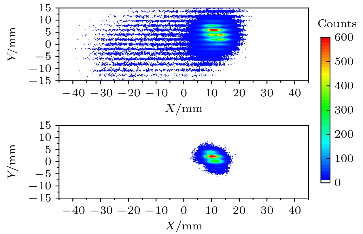 图5为MWPC探测的电子束冷却前和冷 却后的三维束流位置图, 可以清晰地看出经过电子冷却后, 离子束的包络显著缩小, 被很好地限制在MWPC的探测敏感区内, 证明了探测器的可靠性.