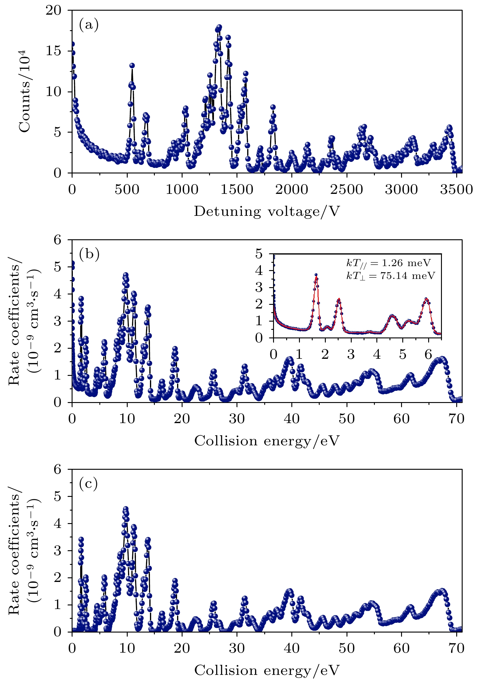 $ \alpha_i ~(i = 0, 1, 2, 3, 4) $ 为拟合所使用的拟合参数. 最终得到了纯粹的DR速率系数谱, 如图6(c)所示.由于实验分辨远大于双电子复合共振的自然线宽, 实验测量的DR峰结构由扁平的麦克斯韦电子束速度分布决定[33]. 拟合测得的低能端的复合速率系数谱, 即图6(b)碰撞能量范围0—6.5 eV的部分, 可得电子束的纵向和横向温度分别为kT// = 1.26 meV和kT⊥=75.14 meV, 图中红色曲线为拟合得到的谱线.