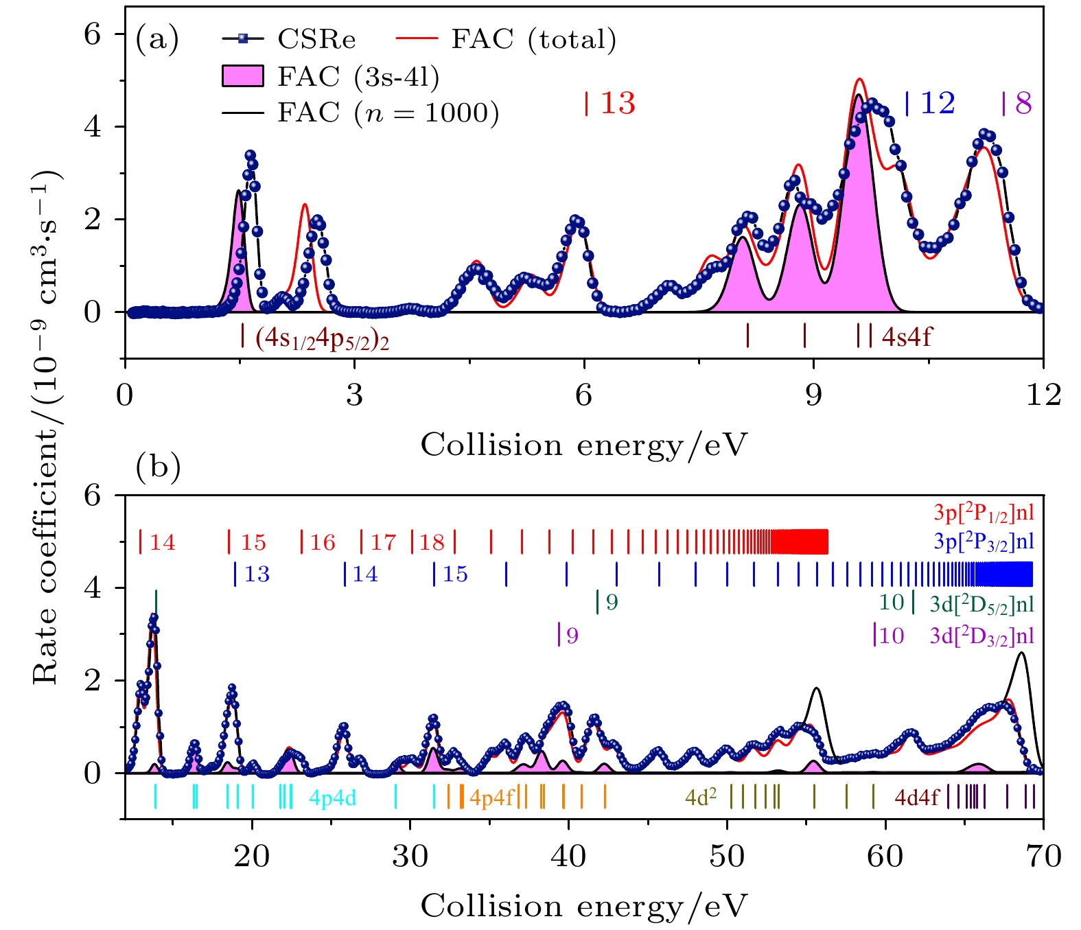 实验最终得到了如图7所示的DR速率系数谱, 对比了质心能量范围0—70 eV的FAC理论计算与实验得到的Kr25+离子的DR速率系数, 其中黑色(蓝色数据点)线为CSRe上多丝正比室探测器测得的DR速率系数, 红色实线为FAC理论计算的结果, 图中不同颜色的短竖线代表不同的里德伯系列, 竖线的横坐标代表对应的双激发态共振能量, 由里德伯公式计算得到: