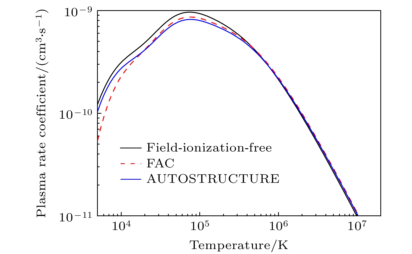 由于场电离效应的存在, 将线系限附近的实验结 果替换为FAC理论计算的结果. 如图8所示, 理论计算的结果在温度低于104 K时略低于实验导出的等离子速率系数, 主要原因是上文中提到的低能量共振位置与共振强度理论计算不准确. 我们还将AUTOSTRUCTURE程序理论、FAC理论导出的等离子体速率系数和上述方法得到的实验等离子体速率系数进行了对比, 整体符合得很好, 在温度小于106 K的区间, 相差不到20%, 在温度大于106 K小于107 K的区间, 相差不到10%.