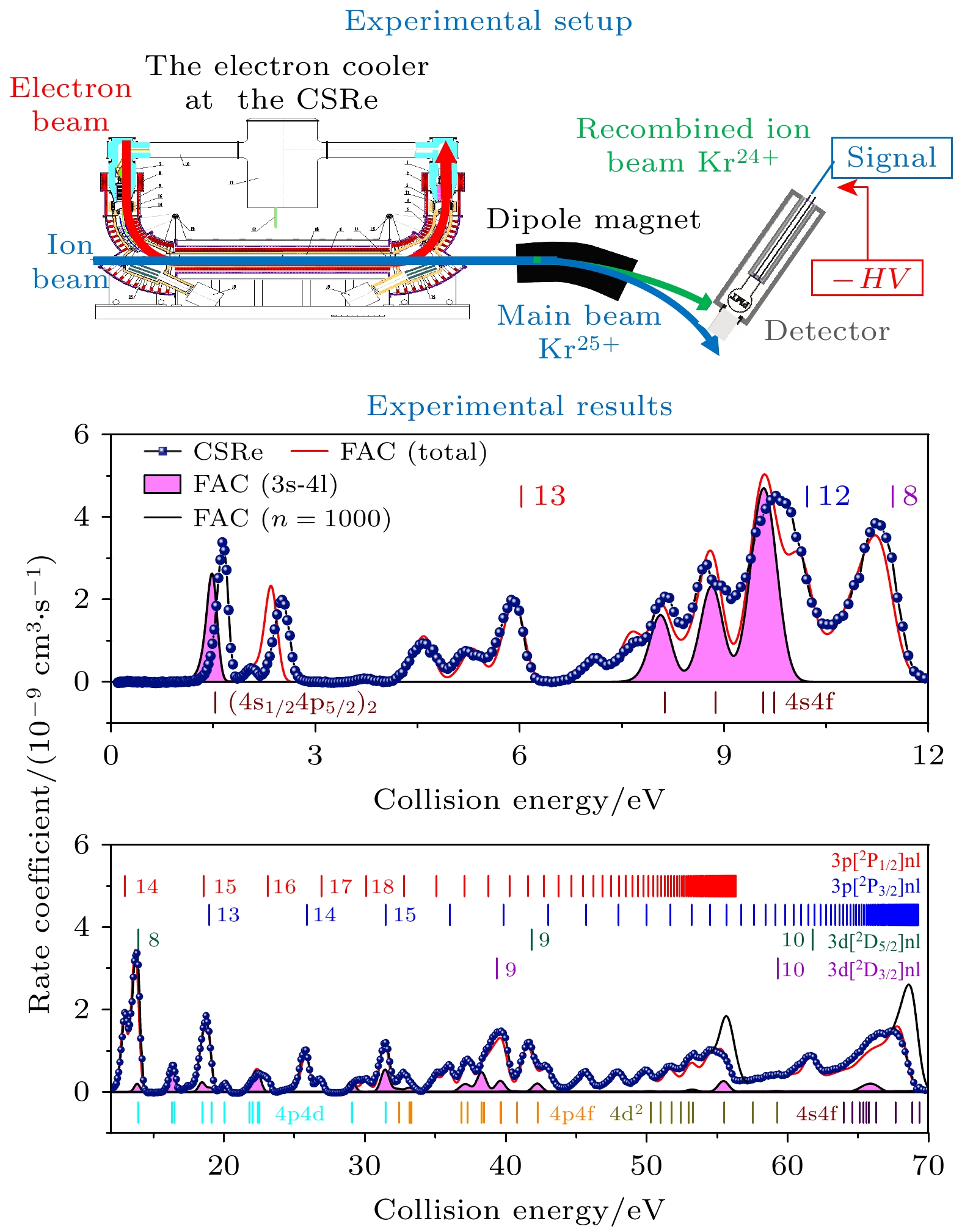 $ 3{\mathrm{s}}\to 4{\mathrm{l}} \;(\Delta n=1) $ 的共振跃迁对实验谱线有很大的贡献. 实验结果表明, CSRe双电子复合实验平台具有非常好的稳定性和可重复性, 能够为下一步开展更高电荷态离子的双电子复合精密谱学实验、检验强场量子电动力学效应以及原子核性质精密测量等前沿实验提供支持.Abstract: The experimental study of precision spectroscopy of dielectronic recombination (DR) of highly charged ions is not only important for astronomical plasma and fusion plasma, but also can be used as a new precision spectroscopy to test the strong-field quantum electrodynamic effect, measure isotope shift, and extract the radius of atomic nuclei. An specially designed electron beam energy detuning system for electron-ion recombination precision spectroscopy experiments has been installed on the heavy ion storage ring CSRe in Lanzhou, China, where the electron-ion collision energy in the center-of-mass system can be detuned to 1 keV, and an independently-developed plastic scintillator detector and multiwire proportional chamber detector have been installed downstream of the electron cooler of the CSRe for detecting recombined ions. The multiwire proportional chamber detector has the ability to non-destructively monitor the profile of the ion beam in real-time while acquiring the recombined ion counts, providing guidance for optimizing the ion beam. On this basis, the first test experiment on dielectronic recombination of Kr25+ ions is carried out at the CSRe, and the dielectronic recombination rate coefficients in a range of 0–70 eV in the frame of center-of-mass are measured. In order to fully understand the experimental results, we calculate the dielectronic recombination rate coefficient of the Kr25+ ion by using the flexible atomic code (FAC) and make a detailed comparison with the experimental result, showing that they are in good agreement with each other, and only the resonance energy values of the two resonance peaks at 1.695 eV and 2.573 eV are significantly different. In addition, the DR resonance energy values and intensities are obtained by fitting the experimental results in a range of 0–35 eV, and we find that the transition 3s→4l (∆n = 1) contributes significantly to the experimental spectral lines. Furthermore, we compare the plasma rate coefficients derived from the DR rate coefficients with those derived from the AUTOSTRUCTURE and FAC theories, which differ by 20 percent in a temperature range less than 106 K. The experimental results show that the DR experimental platform of the CSRe has very good stability and reproducibility, and can provide support for the future DR experiments of highly charged ion, i.e. for testing strong-field quantum electrodynamics effect and measuring the properties of atomic nuclei. -