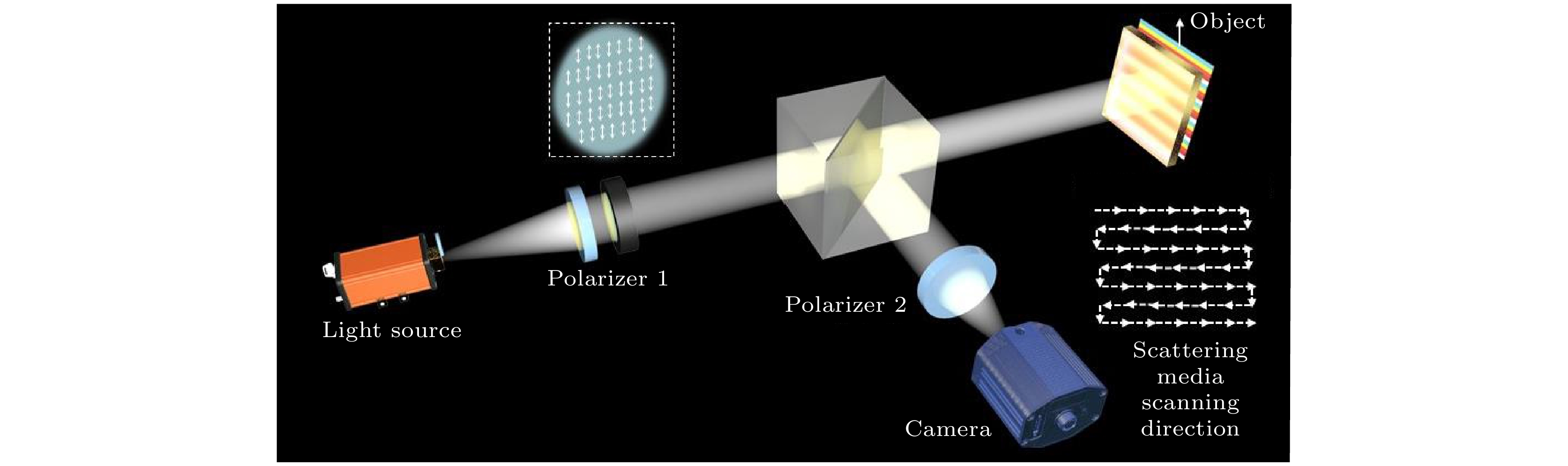 $ {R}_{{\mathrm{c}}{\mathrm{a}}{\mathrm{m}}}\left(z\right) $ 为场景中任一点到探测器的距离;$ {I}_{{\mathrm{s}}{\mathrm{o}}{\mathrm{u}}{\mathrm{r}}{\mathrm{c}}{\mathrm{e}}}\left(z\right) $ 为光源的辐照度; b为介质的散射系数, 表征了介质在某一个角度方向$ \theta $ 上的后向散射饱和度; c为衰减因子;$ \theta \in \left[0, {\mathrm{\pi }}\right] $ 是光波在散射介质中的散射角, 根据Fresnel公式可知, 在不同散射角时x和y方向上所产生的振幅和相位存在差异性, 这就导致背景散射光场呈现出明显的偏振特性[27].为了验证和说明散射光场的强度和偏振特性变化情况, 根据如图1所示的原理图搭建光学成像系统并进行数据采集. 实验中利用白光光源后安装偏振片来产生完全偏振光照明, 光路中采用毛玻璃作为散射介质, 通过旋转偏振片2进行不同偏振方位角图像的采集.