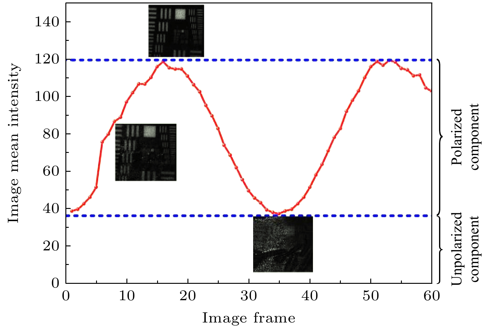 如图2所示, 对偏振片2每旋转3°进行光场信息的记录, 共采集了60幅图像, 其强度变化情况如图2所示. 根据不同偏振方位角散射光场图像及均值强度分布曲线可知, 散射光场强度随偏振方位角的变化有显著的明暗变化, 并且整体服从余弦函数分布规律. 然而值得注意的是, 无论是背景散射信息还是目标信息部分都呈现部分偏振特性, 即由完全偏振和完全非偏振两部分组成, 在忽略了相干部分后, (1)式可进一步优化如(3)式的表示形式: