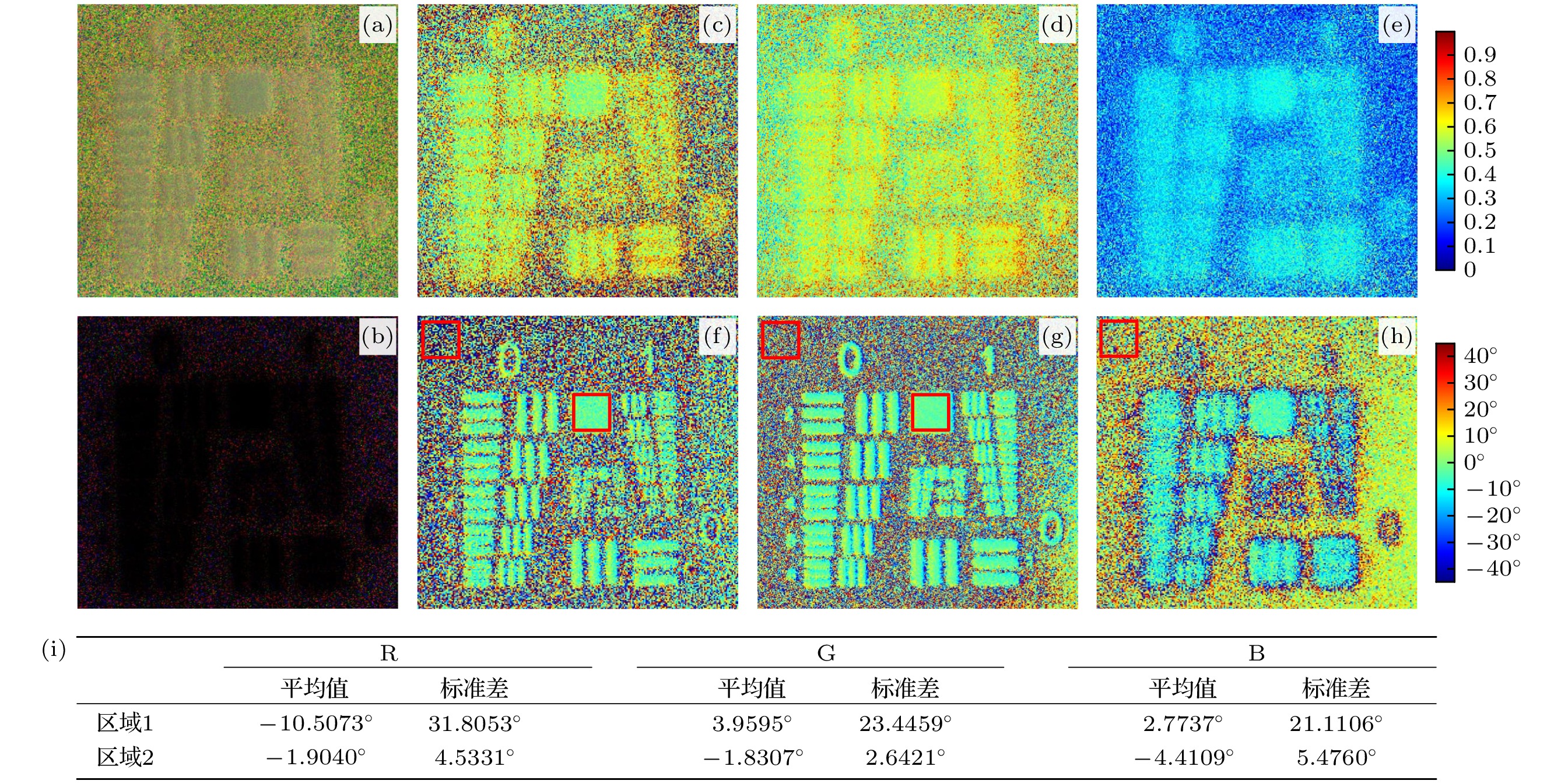 图 3 散射光场偏振特性分布情况 (a) 偏振度图像; (b) 偏振角图像; (c)—(e) RGB三通道的偏振度图像; (f)—(h) RGB三通道的偏振角图像; (i) RGB三通道的偏振角图像子区域的数值分析