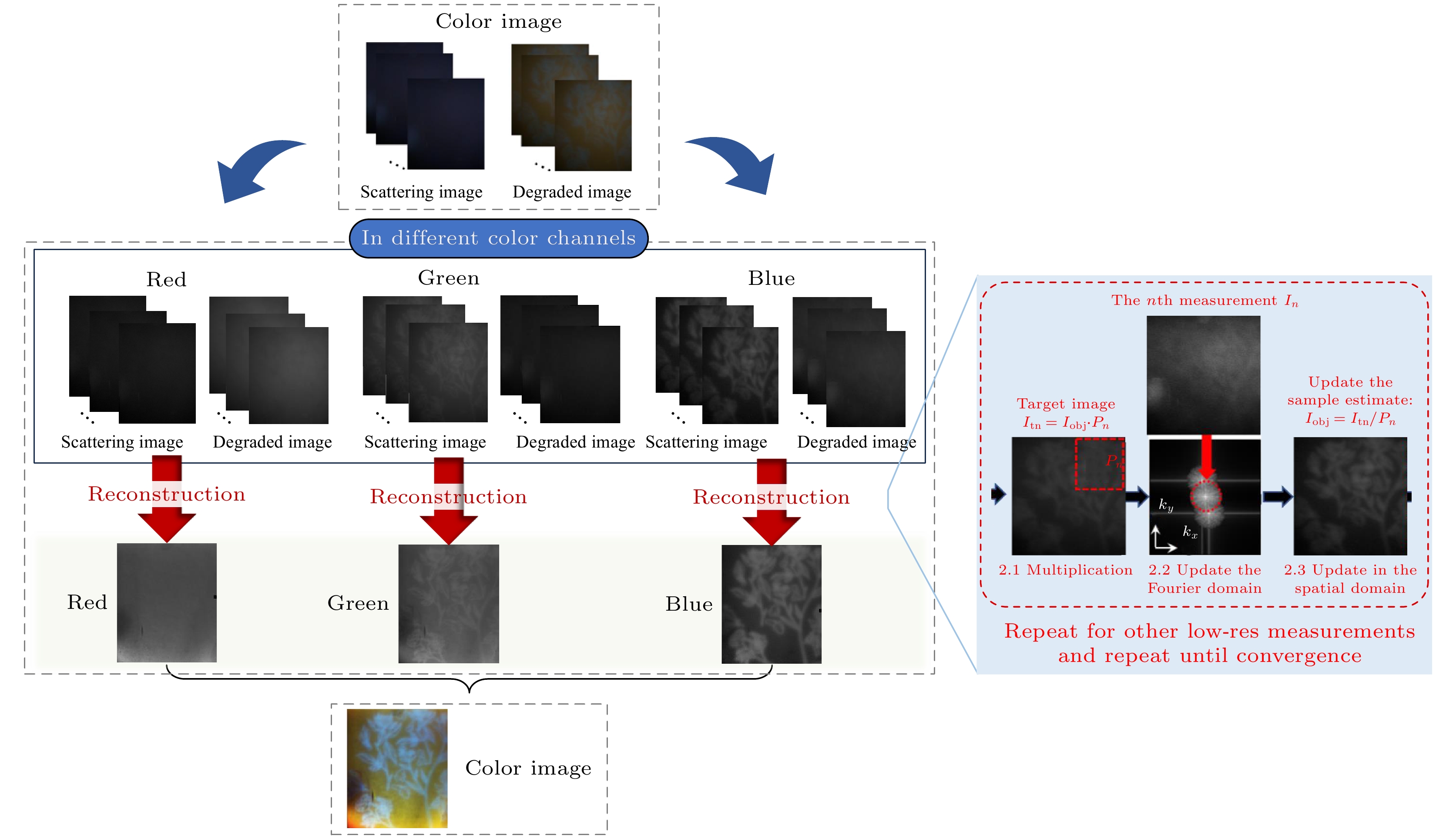 $ {I}_{{\mathrm{s}}{\mathrm{c}}{\mathrm{a}}{\mathrm{t}}, n, k}(x, y) $ 重复1)—3)的更新过程, 直到算法收敛(连续恢复的两幅图像的均方误差小于预定值), 则该过程停止.5)通道合成