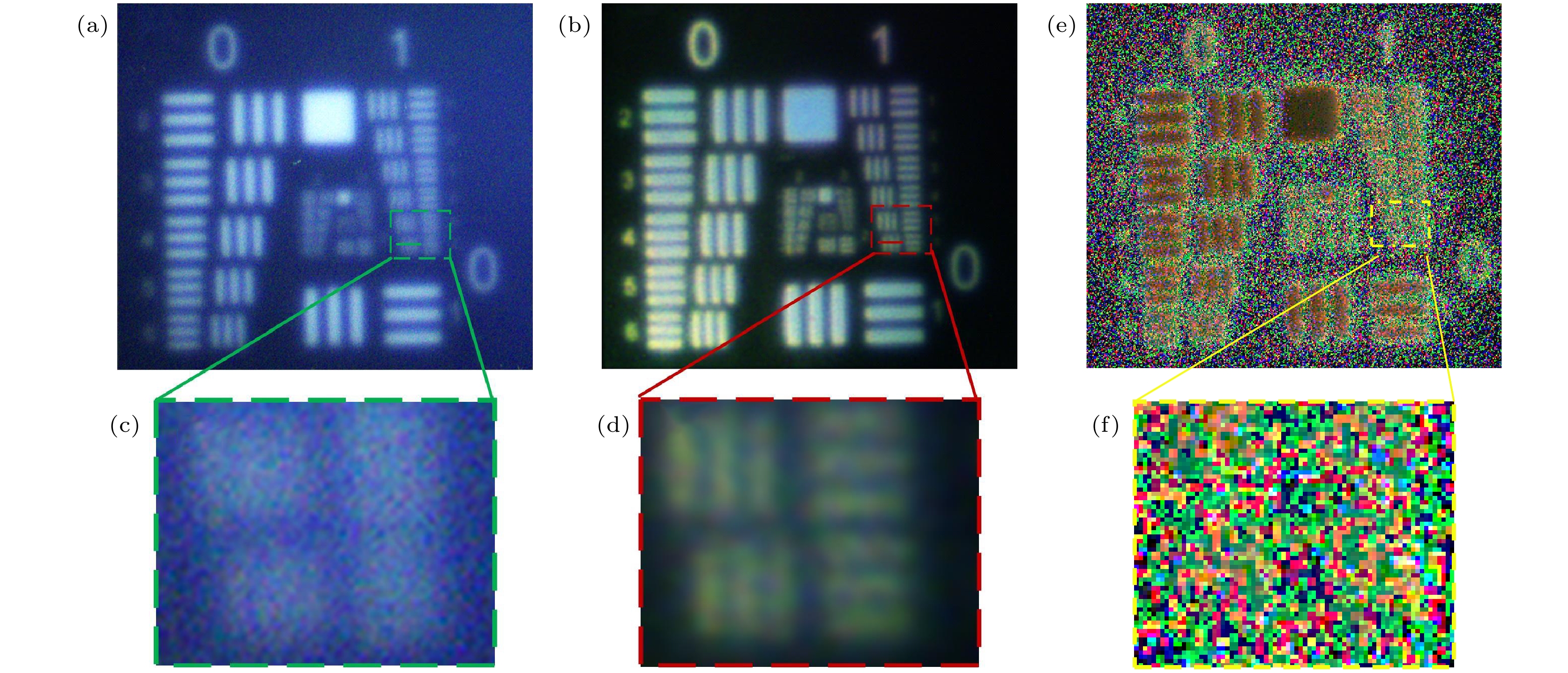 图 5 分辨率靶标的实验结果 (a) 探测器获取的原始强度图像; (b) 本文算法重建所得结果; (c) 原始强度图像的局部放大; (d) 本文重建结果的局部放大; (e) 传统偏振去散射算法重建结果; (f) 传统偏振去散射重建结果的局部放大