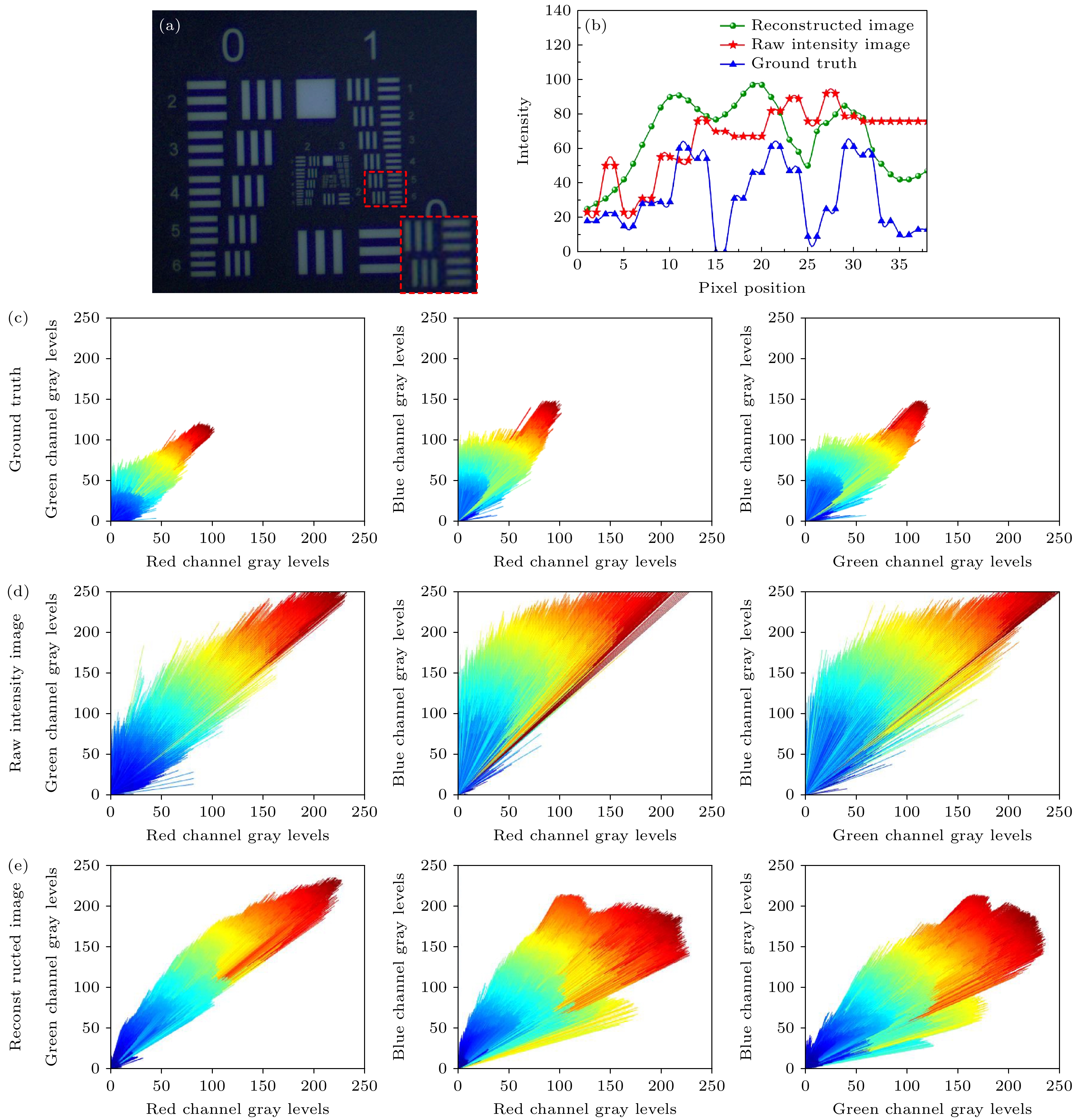 图 6 (a) 目标靶板的真值图像; (b) 图5所示的1组6的分辨率线对像素强度值分布图; (c), (d)和(e)分别为图6(a)、图5(a)和图5(b)的R, G, B三通道像素强度统计值