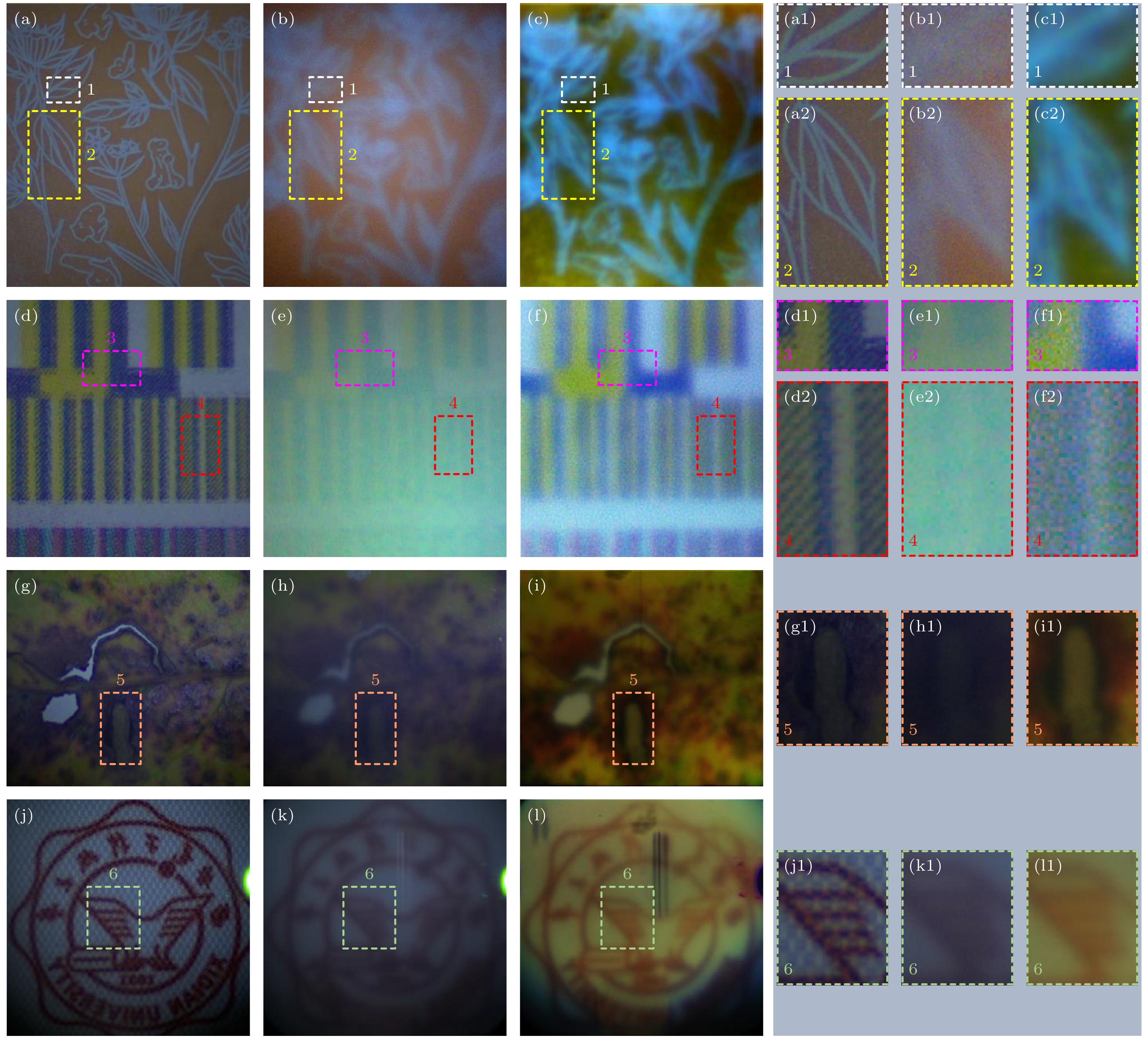 Figure 7. Reconstruction images of different objects (paper, plastic, diseased leaves and woven fabric) using the proposed method: (a)–(c), (d)–(f), (g)–(i), (j)–(l) The ground truth image, raw intensity image and reconstructed image; (a1)–(l1), (a2)–(f2) the detail information of area 1–6 in images.
