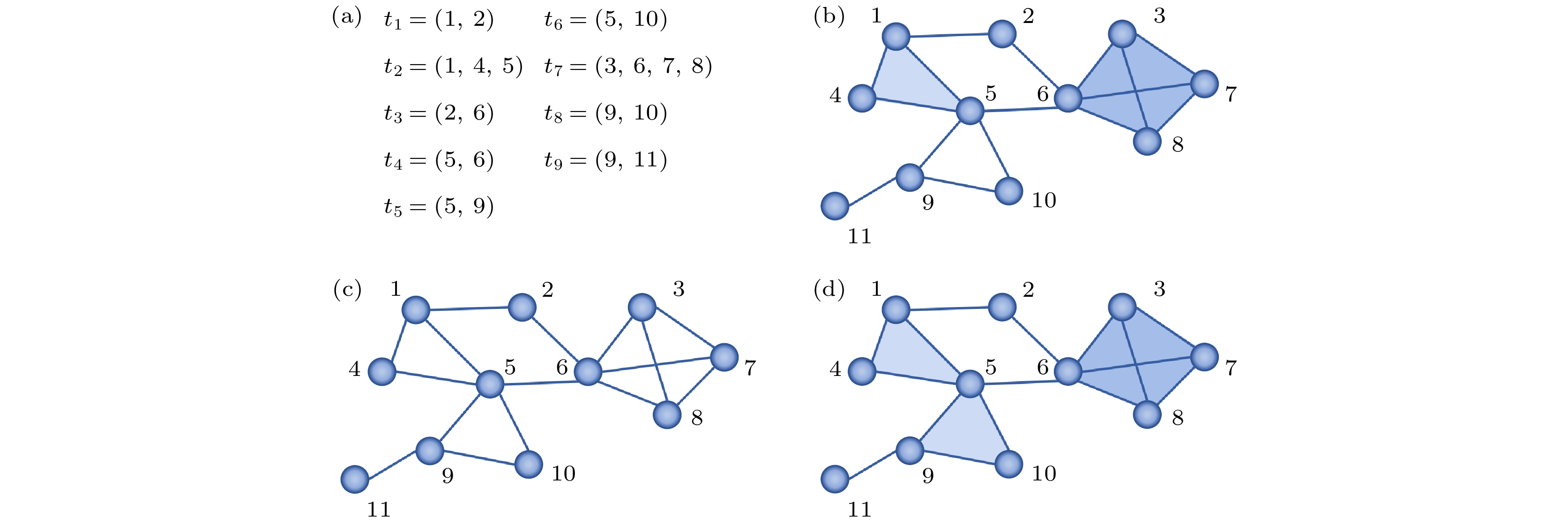 图 2 单纯形网络相关示意图 (a) 一组时序高阶交互数据; (b) 一个11节点的单纯形网络; (c) 基于图(b)中单纯形网络的骨架网络; (d)一个11节点的团复形网络