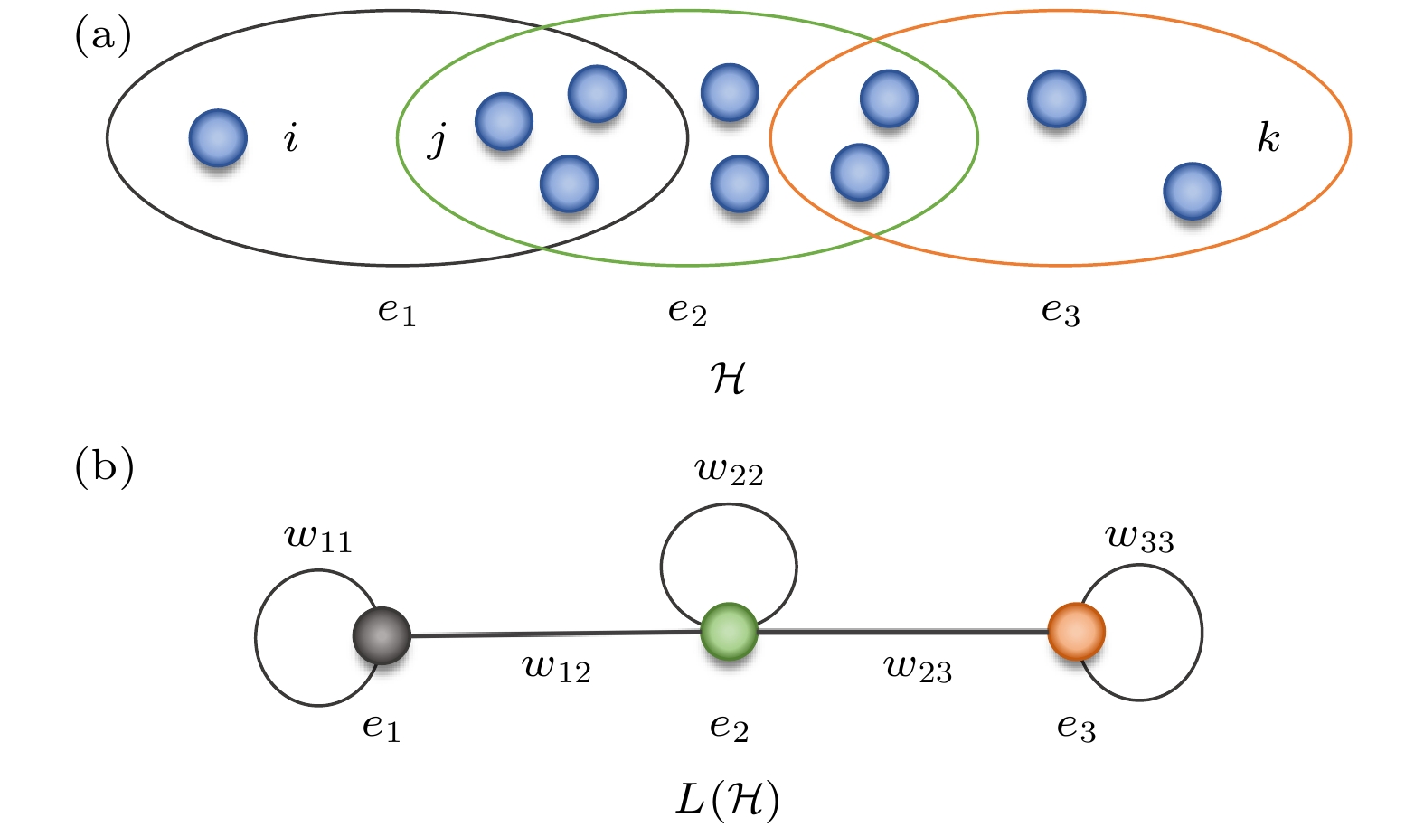$L ({\cal{H}}) $ , 图3(a)之中的3条连边在图3(b)中被当作节点,$ e_1 $ 和$ e_2 $ 之间在图3(a)中有重复的节点, 所以图3(b)中它们之间存在连边. 接下来可以根据加权线图来定义超图中节点$ v_i $ 和$ v_k $ 的距离为在这里