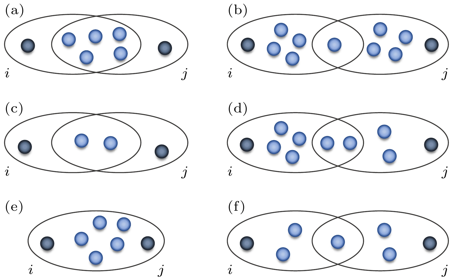 $ v_i $ 和$ v_j $ 的距离要小于图4(b)中节点$ v_i $ 和$ v_j $ 的距离; 3)当两个节点之间经过超边的数量相同时, 所涉及的超边中的节点越多, 距离应该越大, 如图4(d)中节点$ v_i $ 和$ v_j $ 的距离要大于图4(c) 中节点$ v_i $ 和$ v_j $ 的距离; 4)两个节点之间涉及到的节点数量相同时, 超边数量越多, 距离应该越大, 如图4(f)中节点$ v_i $ 和$ v_j $ 的距离要大于图4(e)中节点$ v_i $ 和$ v_j $ 的距离. 根据这4种情况定义了加权线图中的权重, 也就是超图中两条超边$ e_i $ 和$ e_j $ 之间的权重$ w_{ij} $ :和成对交互作用网络一样, 超节点之间也可能存在多条路径, 两个节点之间距离最短的路径被称作最短路径(shortest path), 其长度为最短路径长度[78]. 两个节点之间的最短路径长度是固定的, 但是其最短路径可能不唯一.