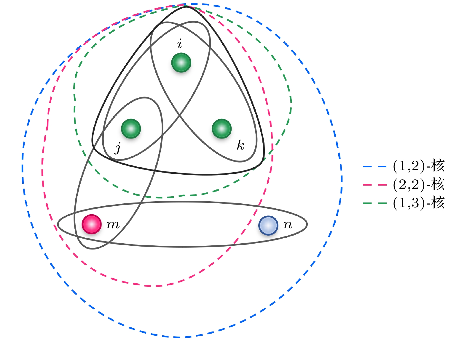 Mancastroppa等[61]提出了超核数的概念, 它是通过计算k-核分解的扩展算法——超核分解得到的. 由于超边所含节点数不一样, 所以该分解会存在两个参数——超边的数量k和超边度c, 简单来说,