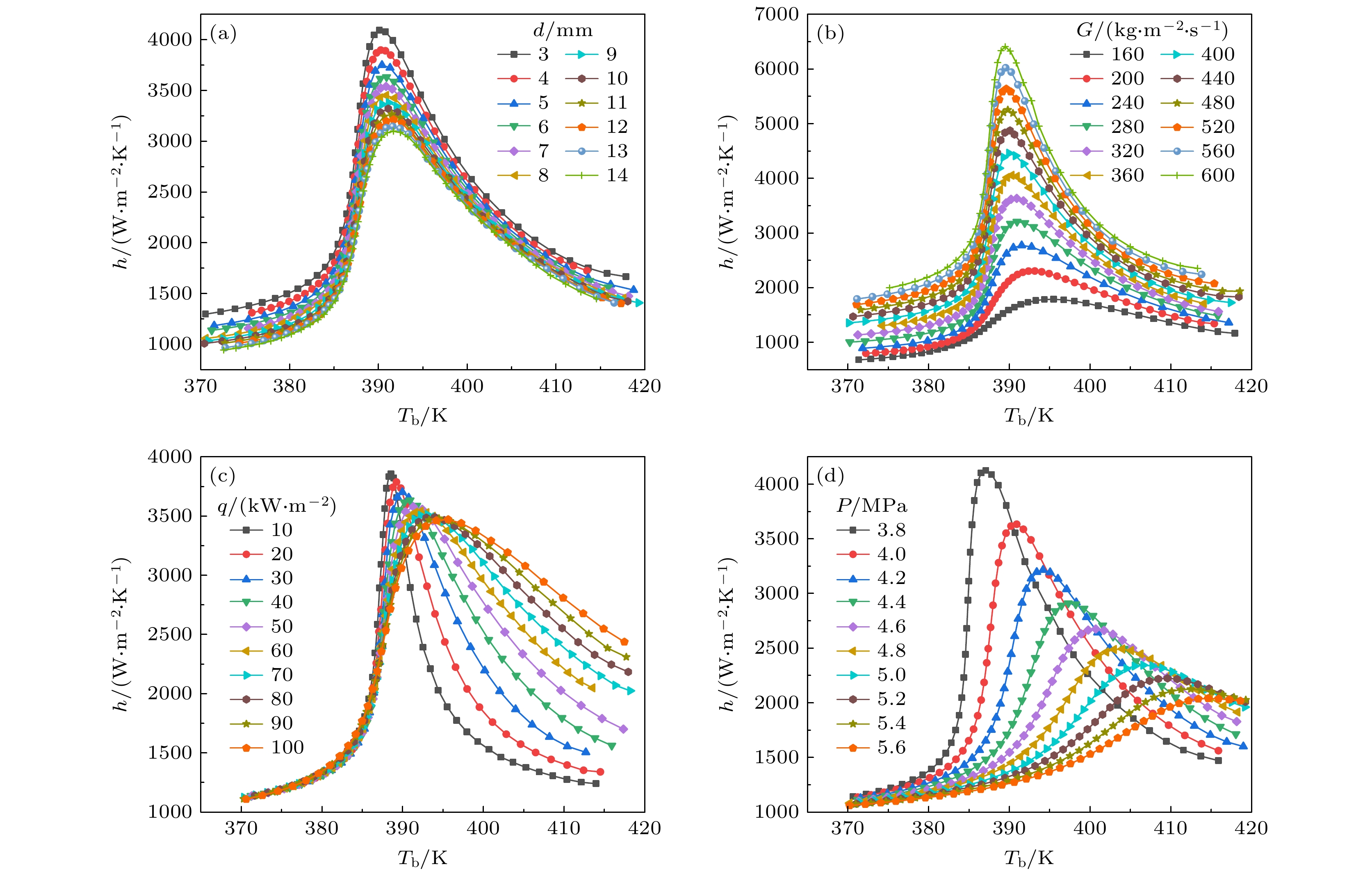 图1(a)中, 随着水平管管径的增大, 传热系数在整个温度范围内降低, 并且在拟临界温度附近降低地最为明显, 但传热系数峰值位置几乎不变; 图1(b)中, 随着质量通量的升高, 传热系数在整个温度范围内大幅提高, 尤其在拟临界温度附近, 但传热系数峰值位置几乎不变; 图1(c)中, 随着热流密度的增大, 低温段传热系数几乎不变, 高温段传热系数大大提高, 传热系数峰值降低并向右移动; 图1(d)中, 随着压力的增大, 低温区域传热强度几乎不变, 高温区域传热系数有所增大, 传热系数峰值降低地较为明显并且峰值位置明显向高温区移动.