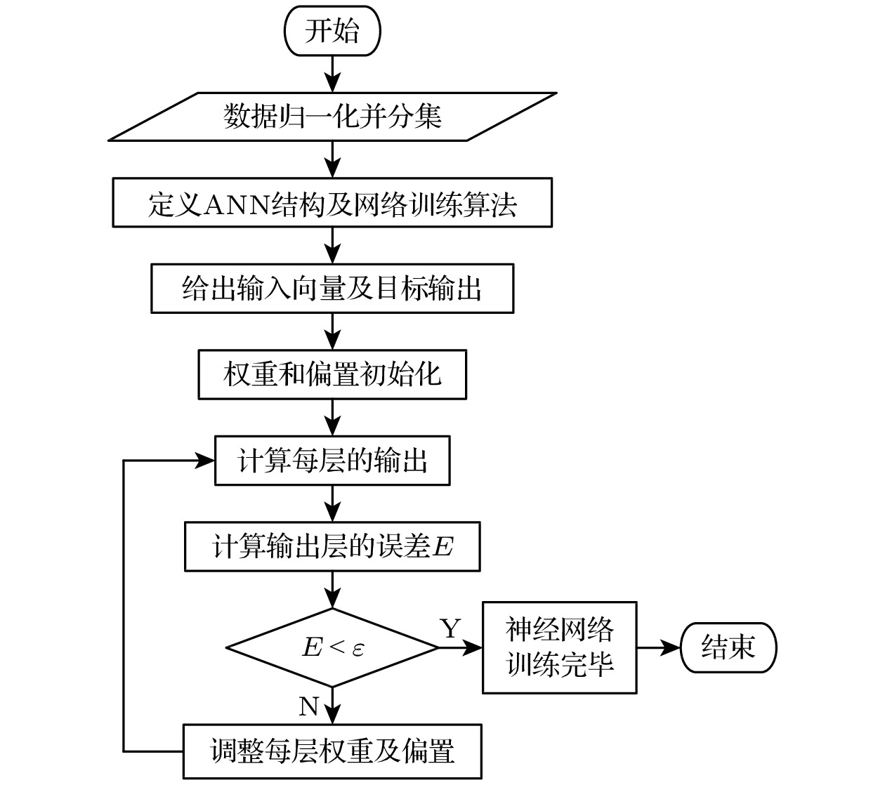 BP网络的具体训练过程如图3所示. 反向传播算法包含信息正向传递和误差反向传播. 在正向传递时, 输入信号通过激活函数由输入层传递到输出层, 每层神经元只影响下一层. 若输出层未达到期望输出, 反向传播开始. 计算输出层误差, 将误差信号反传, 更新各层神经元权重和偏置, 直至达到期望输出目标. 首次迭代时, 每个神经元的权重和偏置均是被随机初始化的.