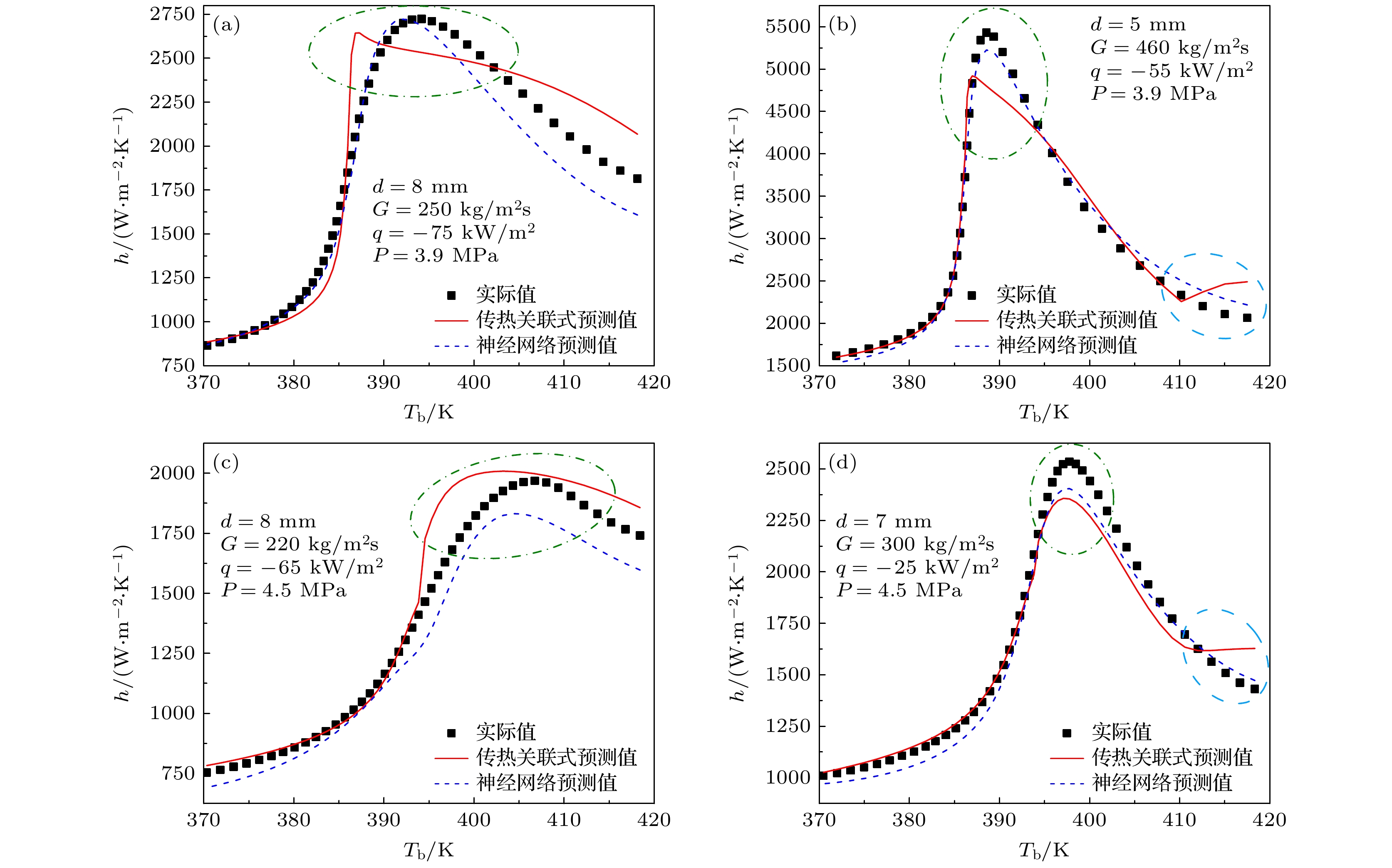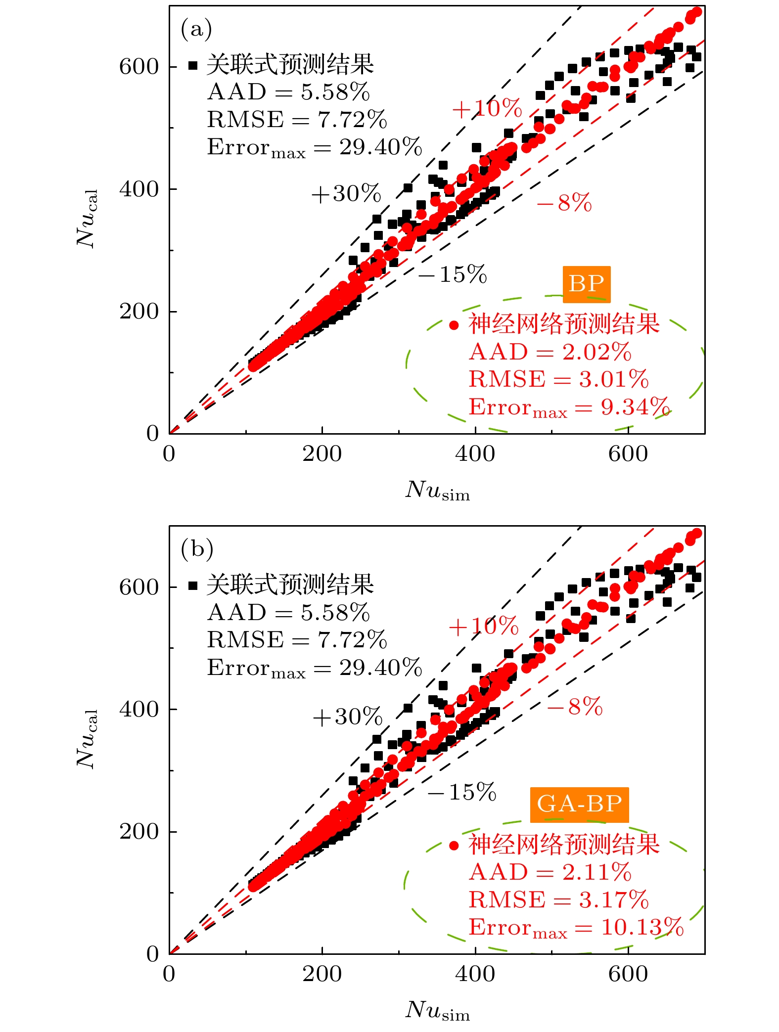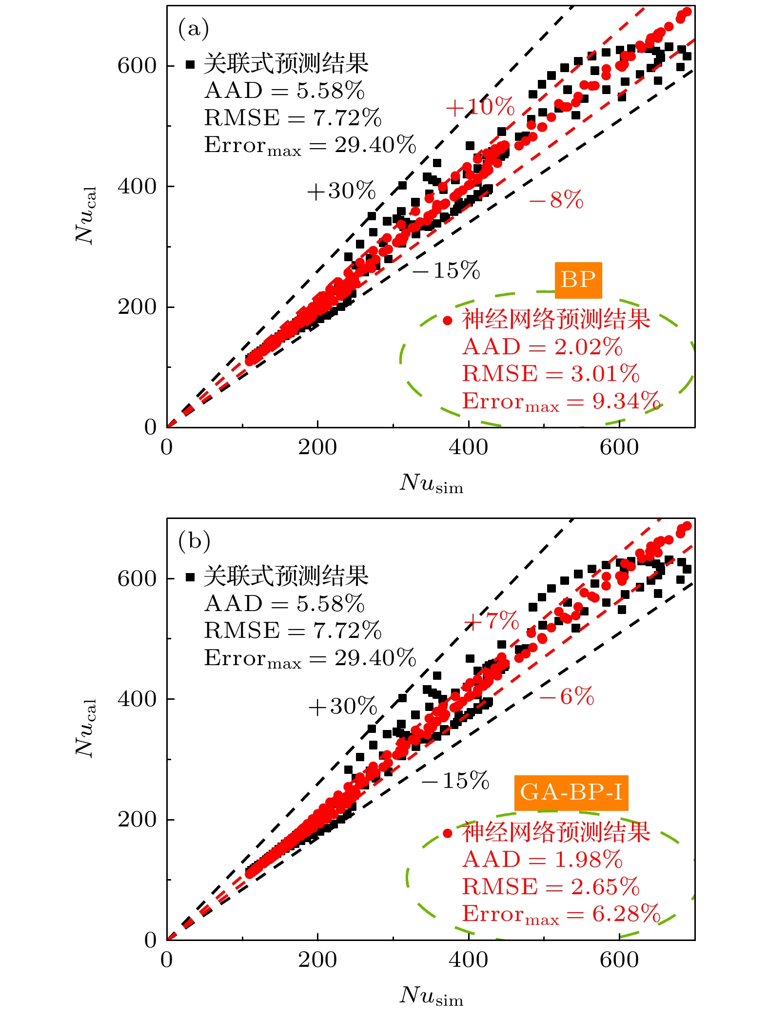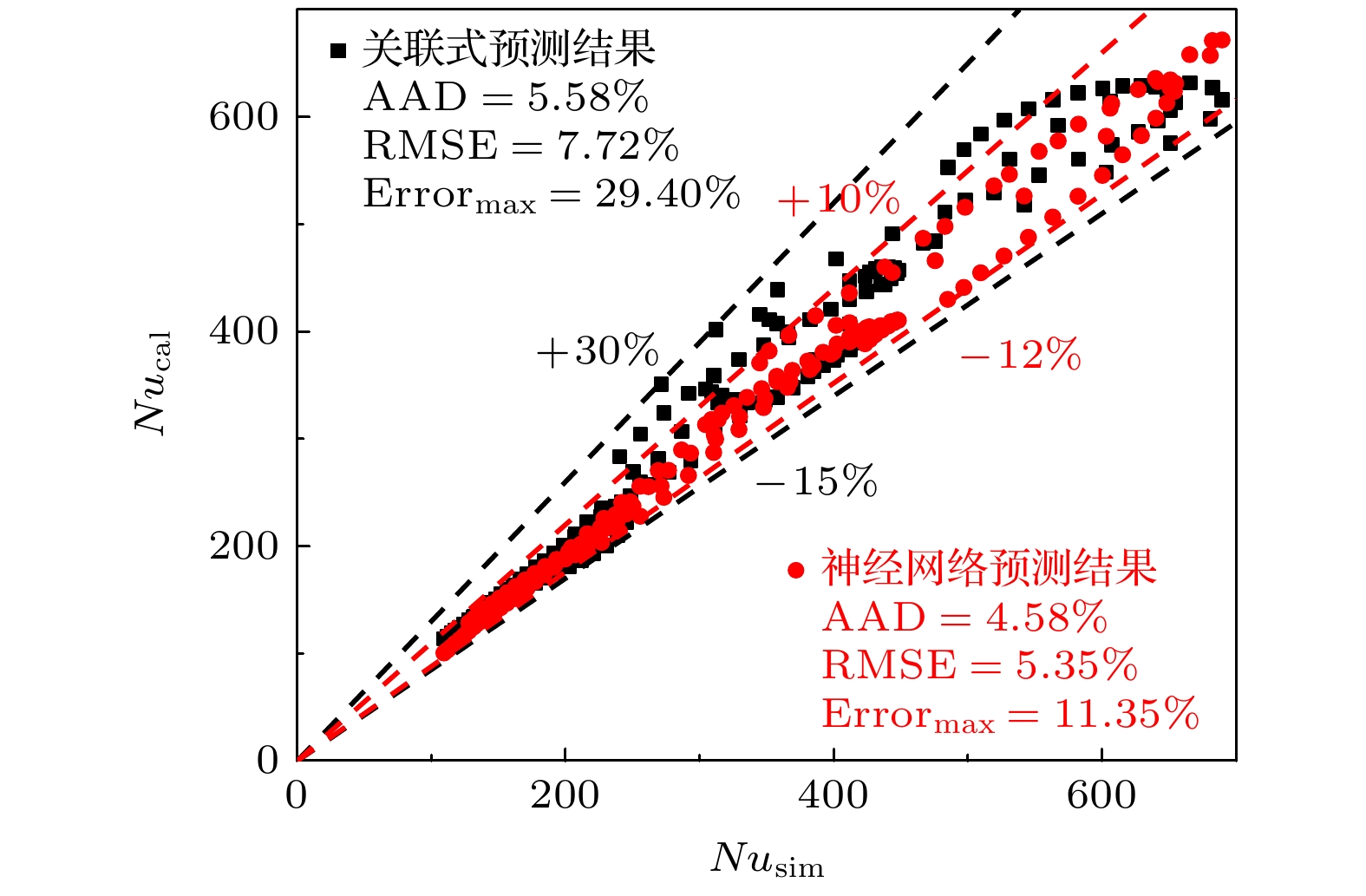 图4为传热关联式和BPNN负号对试验集4种工况传热系数预测的对比结果. 在所有工况下BPNN对于传热系数最大值以及最大值对应的流体温度的预测都更加接近实际值. 此外, 在图4(b), (d)中的高温区域, 见图中蓝圈标注处, 关联式所预测的传热系数的变化趋势不合理, 而BPNN的预测更准确. 图5给出了关联式和神经网络对试 验集全部177组数据点的努塞尔数预测结果的比较. 关联式对全部数据点的预测偏差在–15%— +30%之间, BPNN的预测偏差仅为–12%—+10%. BPNN预测结果相对于实际值的AAD和RMSE略低于传热关联式, 虽然AAD仅降低了1%, 但却使得最大偏差Errormax有了非常显著的改善, 由29.4%降至了11.35%. 综上, BPNN对于试验集的预测表现优于传热关联式.
