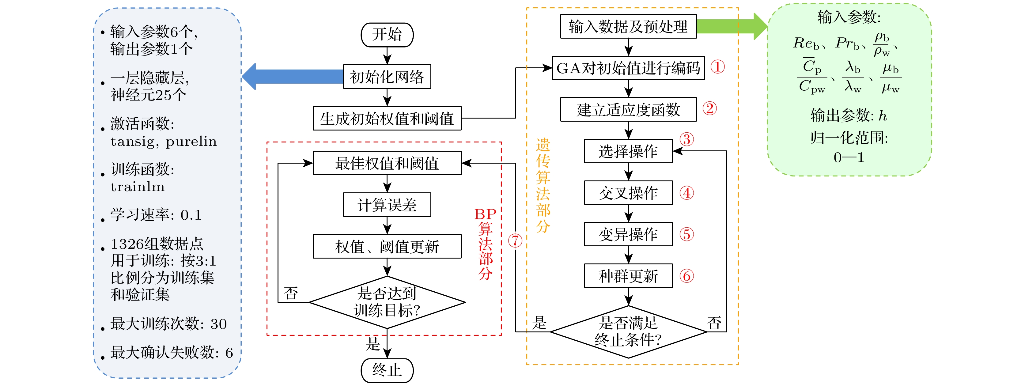 • GA-BP神经网络流程如图6, 包含BP部分和遗传部分. 本研究中, 网络输入层神经元设置为6个, 输入参数为3.3节中的最佳输入组合$ {{Re} _{\text{b}}} $, $ {Pr _{\text{b}}} $, $ {{{\rho _{\text{b}}}} \mathord{\left/ {\vphantom {{{\rho _{\text{b}}}} {{\rho _{\text{w}}}}}} \right. } {{\rho _{\text{w}}}}} $, $ {{{{\overline C }_{\text{p}}}} \mathord{\left/ {\vphantom {{{{\overline C }_{\text{p}}}} {{C_{{\text{pw}}}}}}} \right. } {{C_{{\text{pw}}}}}} $, $ {{{\lambda _{\text{b}}}} \mathord{\left/ {\vphantom {{{\lambda _{\text{b}}}} {{\lambda _{\text{w}}}}}} \right. } {{\lambda _{\text{w}}}}} $, $ {{{\mu _{\text{b}}}} \mathord{\left/ {\vphantom {{{\mu _{\text{b}}}} {{\mu _{\text{w}}}}}} \right. } {{\mu _{\text{w}}}}} $. 输出层神经元1个, 为传热系数. 输入输出参数的归一化范围为0—1. 隐藏层设置为一层. 由于此输入参数组合下BP网络的隐藏层最佳神经元个数为25个, 因此本节GA-BP网络中也将隐藏层神经元固定为25个. 隐藏层和输出层的激活函数分别为tansig和purelin, 训练函数为trainlm, 学习速率为0.1, 均与2.1节BP网络的设置相同. 在2.1节的BP网络训练中, 参与训练的数据点为1326个, 因此本节GA-BP网络的训练也采用这1326组数据点, 并同样按照3∶1分为训练集和验证集. 最大训练次数为30次, 最大确认失败数为6. 由于本节GA-BP网络的训练函数和隐藏层神经元个数均已确定, 因此在GA-BP的训练和预测过程中并未使用测试集的331组数据点. 下面将对图6中的步骤①—⑦进行说明.