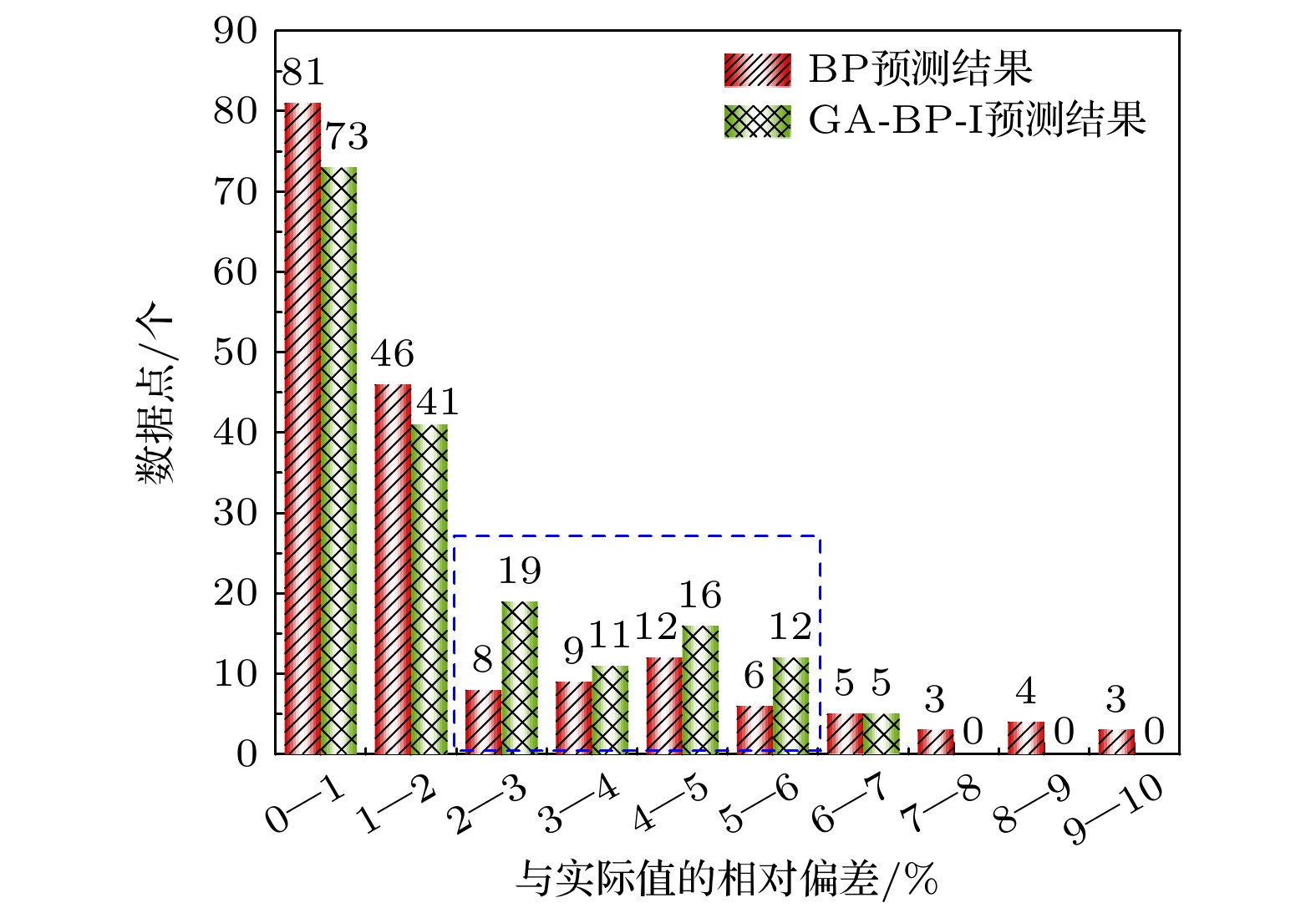 BP网络与GA-BP-I网络对于试验集的努塞尔数预测偏差的对比如图8所示. 可以看到, GA-BP-I网络进一步降低了对于试验集的预测偏差, 尤其是均方根偏差和最大偏差降低地较为明显. 图9为BP网络与GA-BP-I网络对试验集177个数据点的预测偏差的柱状分布图. 可见GA-BP-I的预测结果中偏差在0—1%, 1%—2%的数据点个数少于BP, 并且GA-BP-I预测结果中偏差在7%—8%, 8%—9%, 9%—10%的数据点数为0. 由此可得, GA-BP-I网络的泛化能力使得预测误差极低和极高的数据点数均减少, 更多地向2%—6%集中. 因此, 正如图8所示, GA-BP-I网络预测的平均绝对偏差(AAD)与BP网络差别不是很大, 均方根偏差(RMSE)和最大偏差(Errormax)比BP网络明显降低.
