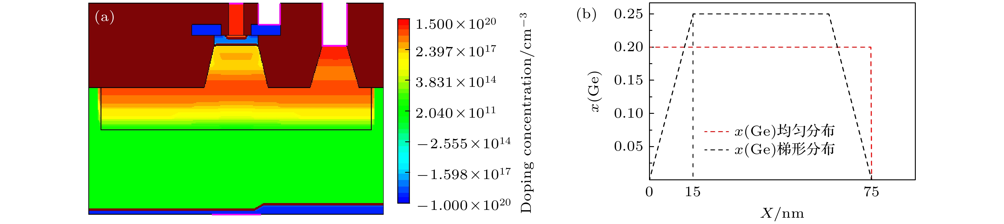 • 图 1  二维器件模型示意图 (a) 二维器件模型图; (b) Ge组分随着纵轴坐标变化示意图