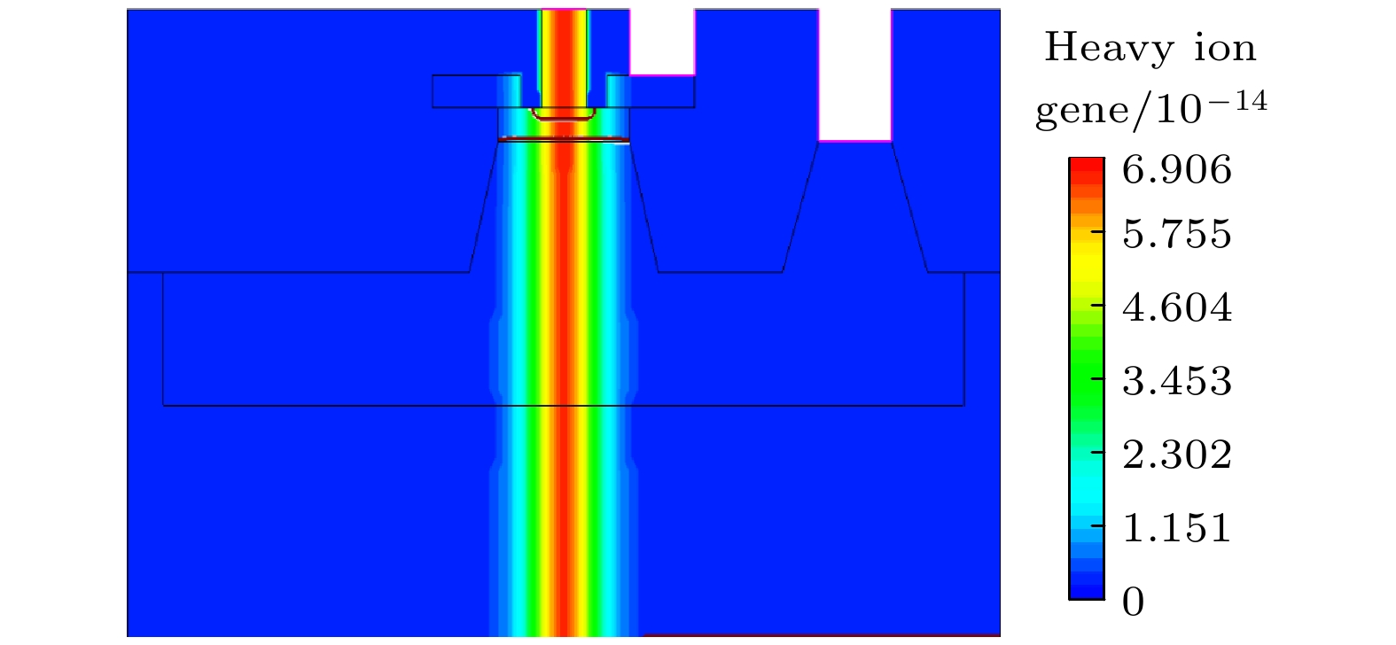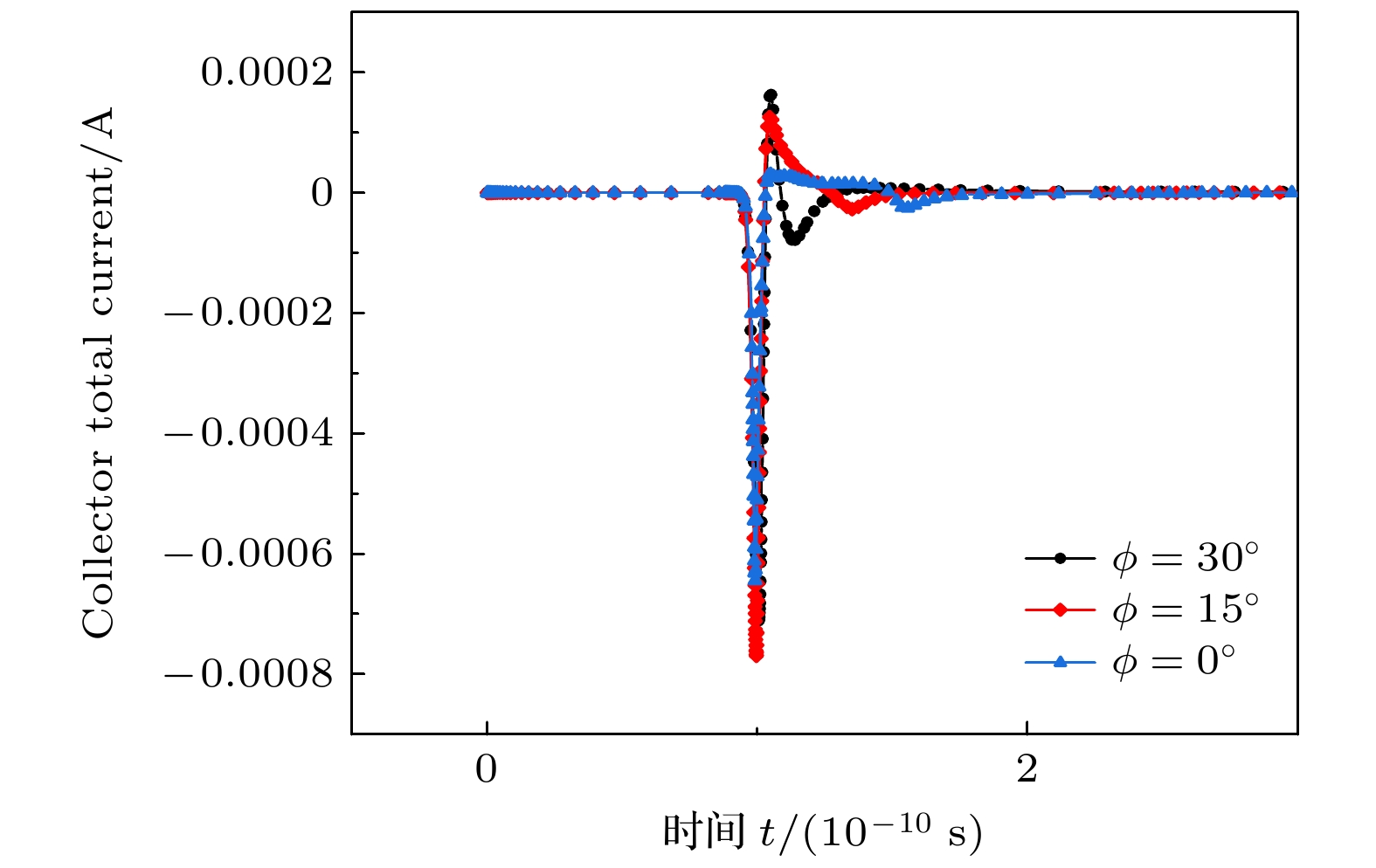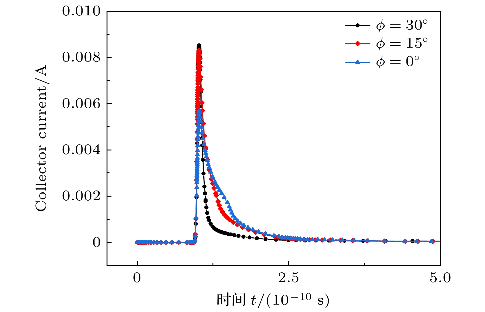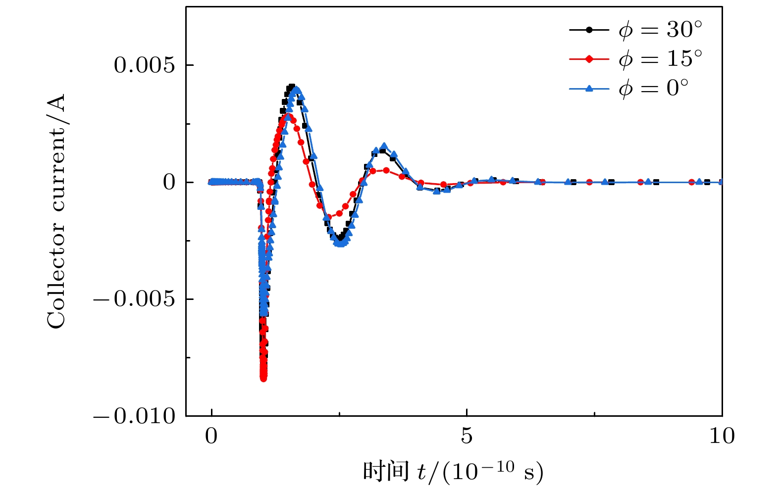 本次仿真使用的模型为0.13 μm的SiGe HBT模型, 离子入射角度选取范围较小, 因此, 采用入射角度分别为0°, 15°以及30°的重离子进行实验, 离子的LET值为10 MeV·cm2·mg–1.