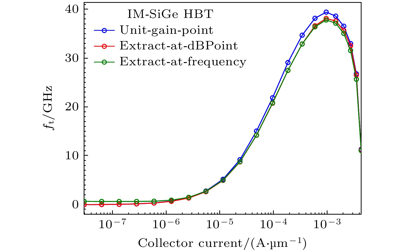 但是如果将IM结构的SiGe HBT作为有源增益级用在LNA中, 其引起的增益衰退与额外噪声会对电路系统产生不可避免的影响. 8HP工艺出现之前, 采用IM-SiGe HBT的RF电路的性能会极大程度地退化, 致使电路无法正常工作. 所以很长一段时间, RF SiGe电路中的辐射效应研究局限于FM结构. 随着技术发展, 8HP工艺的SiGe HBT的fT 以及fMAX 峰值已超过200 GHz[22]. IM结构的SiGe HBT的fT 以及 fMAX 峰值可以达到几十GHz, 这样的硬件条件可保证IM-SiGe HBT不仅可以减低对应电路对于SET的灵敏度, 还可以更少地影响电路性能.