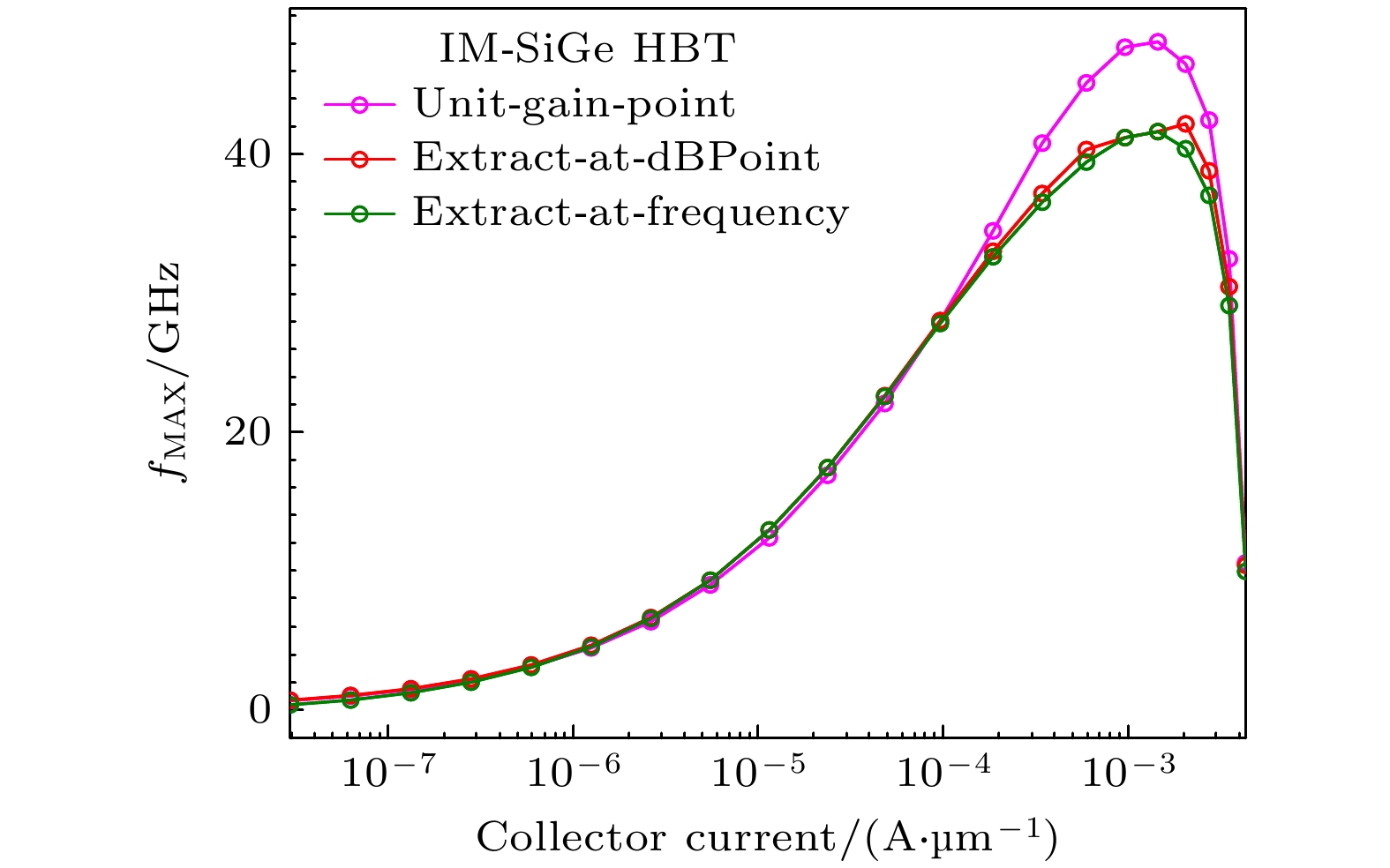 在Sentaurus平台上使用上文搭建的130 nm SiGe HBT器件, 对IM结构的SiGe HBT进行fTfMAX参数的测量, 测量结果分别如图11图12所示, 其中IM-SiGe HBT的fT为36.4 GHz, fMAX为42.2 GHz, 具备了采用IM结构后较好维持电路性能的硬性条件.
