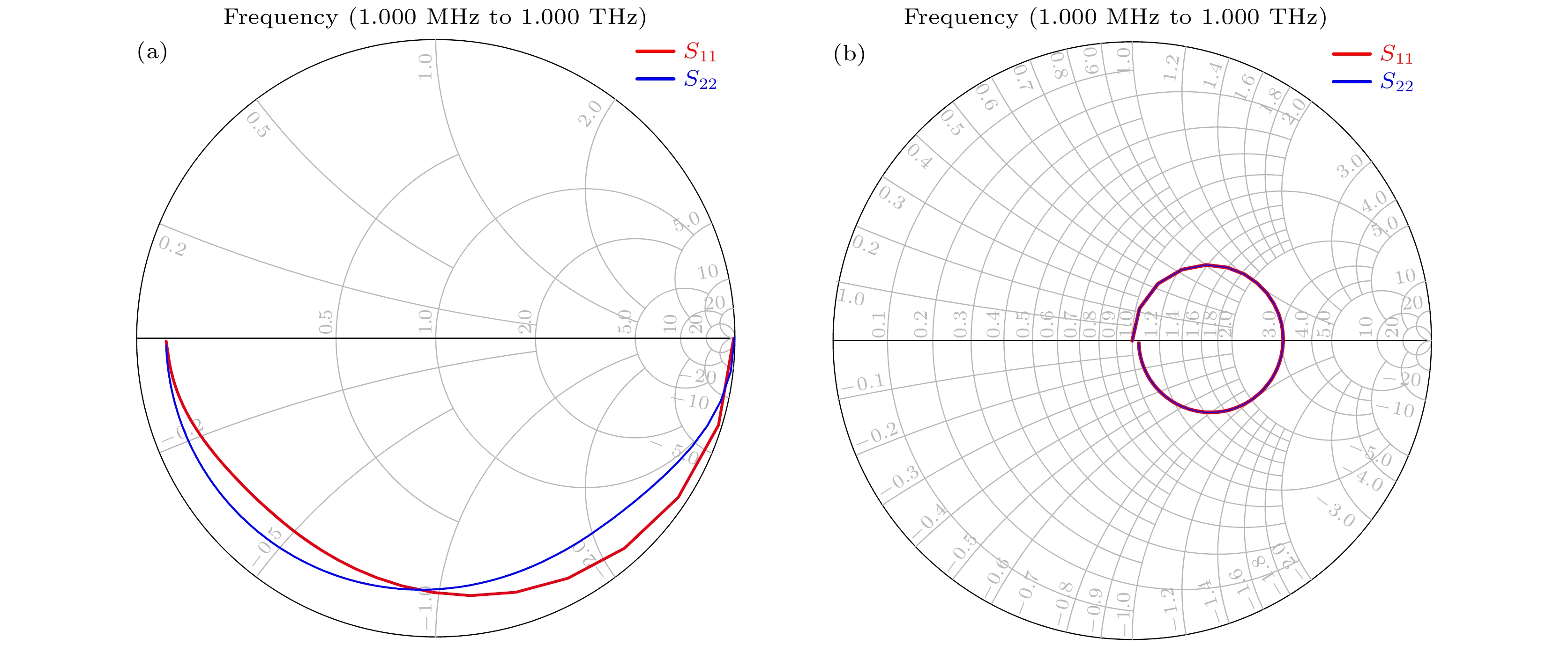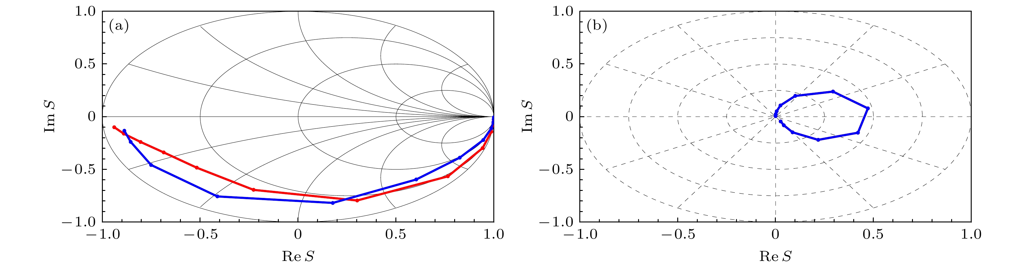 图 14  SiGe HBT器件的S参数Smith图 (a) S11 (红色)/S22 (蓝色); (b) S12 (红色)/S21 (蓝色)