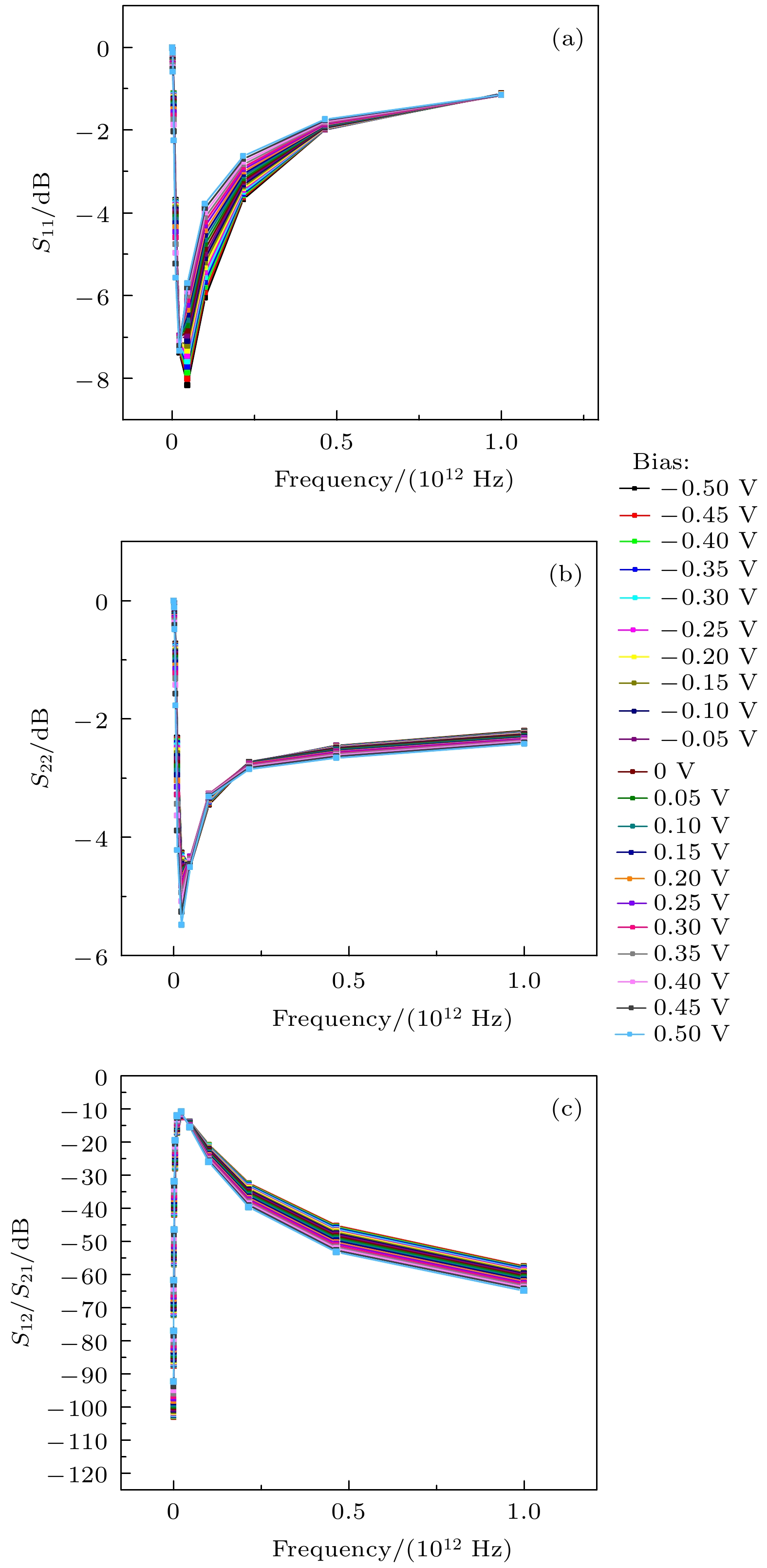 对数据进行处理, 将S参数图化为直角坐标系, SiGe HBT的Vce为固定值1 V, 其中图例的偏压bias为Vbe的值, 范围为–0.5—0.5 V, 如图16所示.