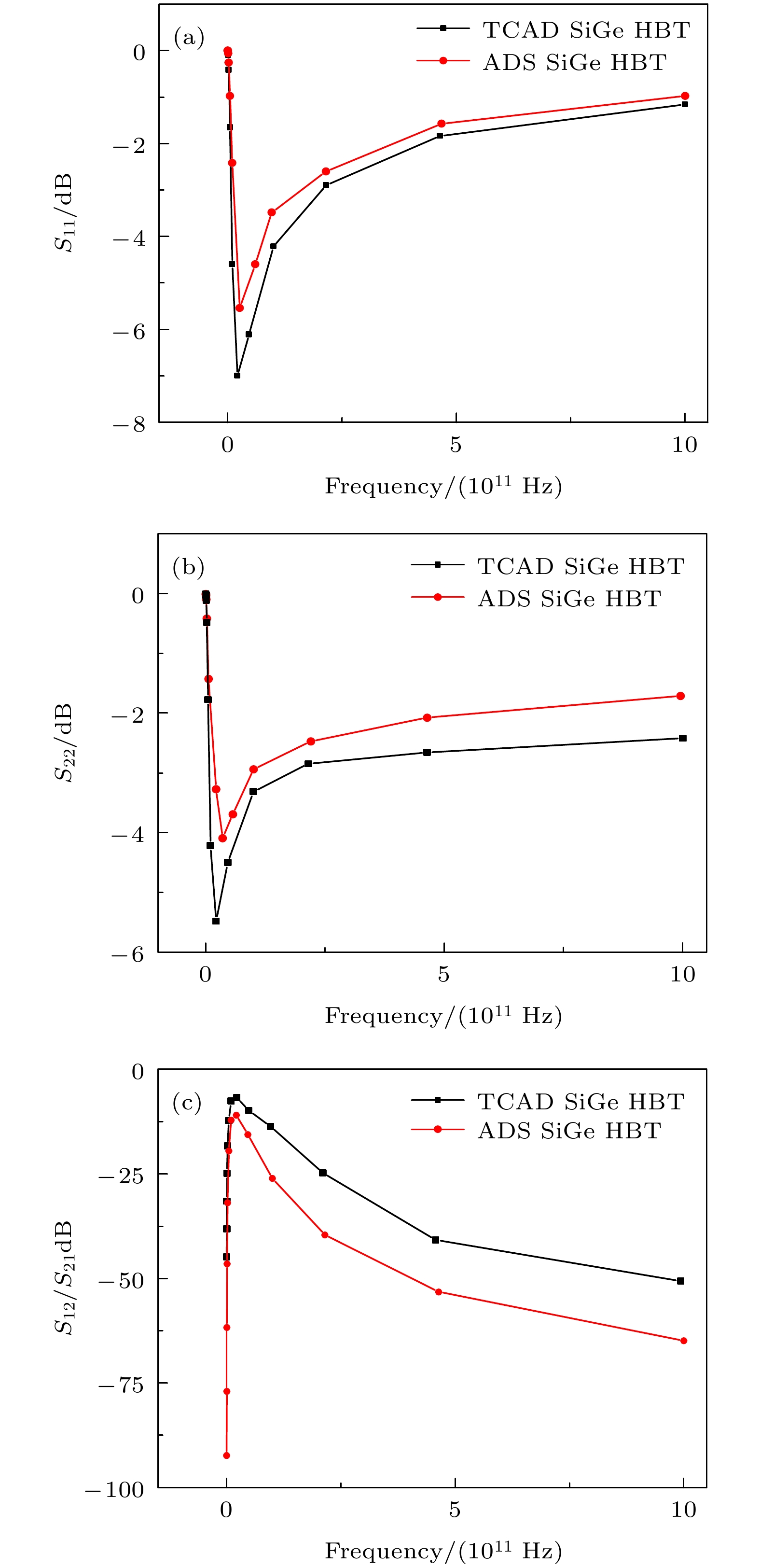 选取Vce为1 V, Vbe为0.5 V的情况, 将TCAD平台的HBT器件以及校准后的ADS平台HBT器件的S参数数据进行比对, 发现其射频特性非常接近, 如图17所示.