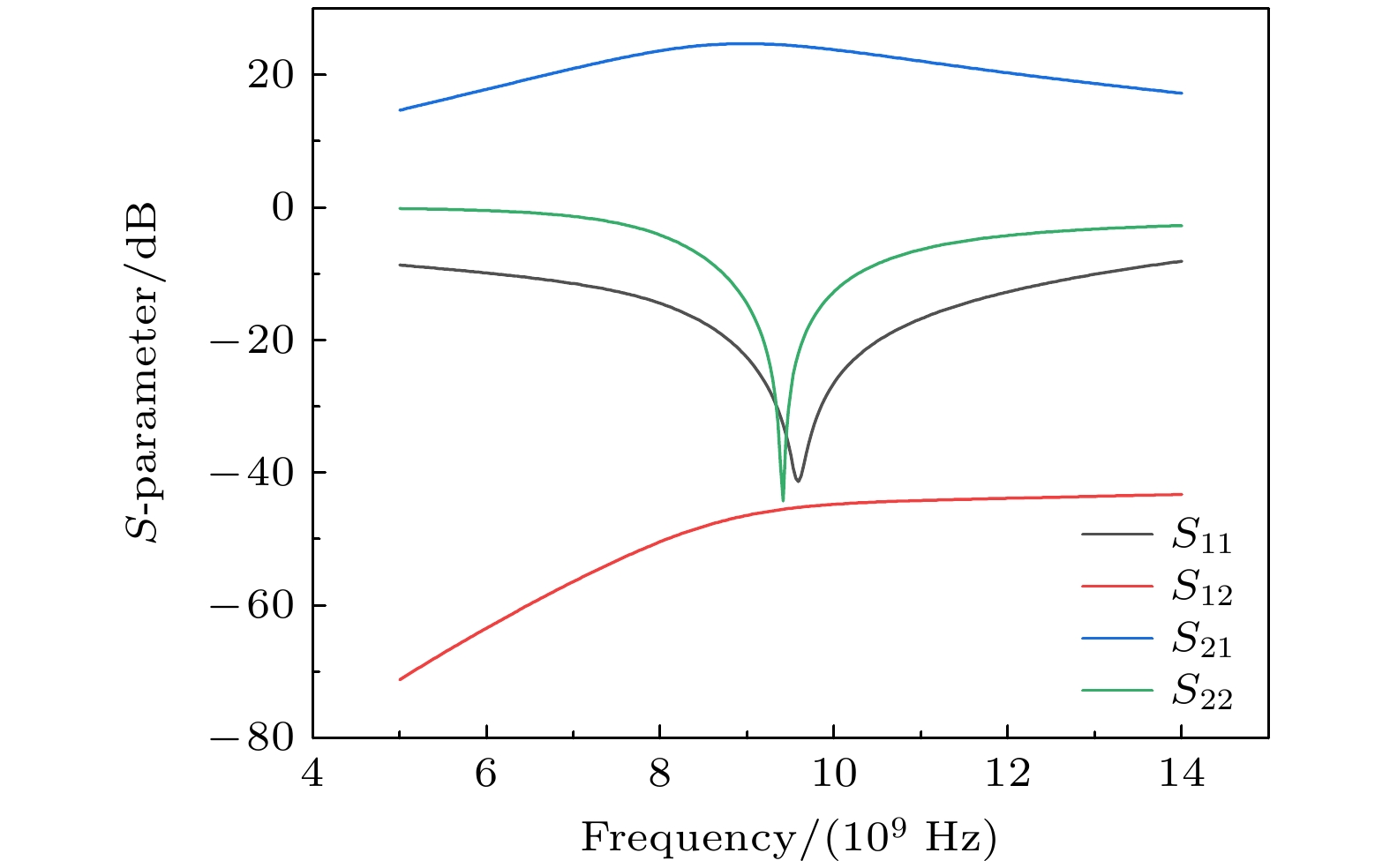 在ADS软件上对于以F-F Cascode为核心的LNA进行测量, 图18为LNA电路的S参数图. 如图18所示, S11S22曲线在中心频率9.5 GHZ处均低于–20 dB, S12低于–40 dB, 具有良好的隔离性, S21所代表的正向功率增益在中心频率处高于20 dB. 该LNA具有良好的RF性能.