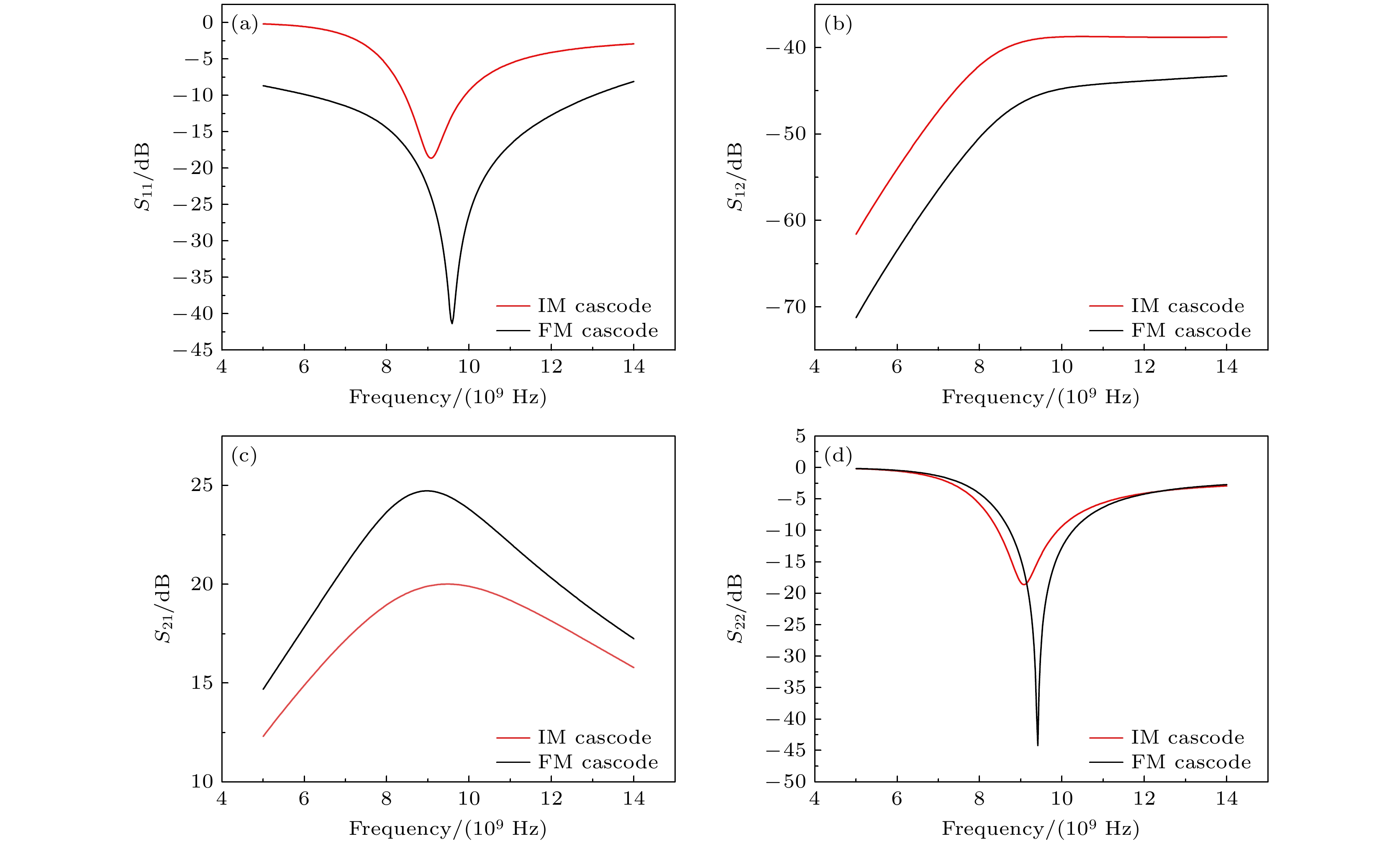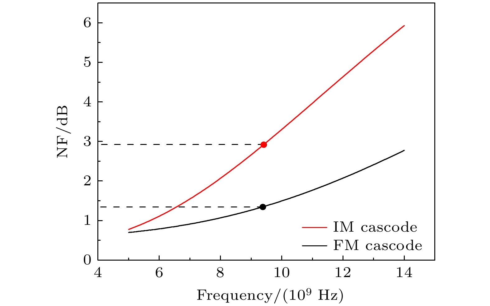 在ADS平台, 将LNA电路中的核心区域(F-F)使用图13中的I-F结构进行替换, 并进一步测量和比对I-F结构对LNA电路性能的影响. 如图19(a)以及图19(d)所示, 采用I-F结构以及F-F结构的LNA的S11曲线和S22曲线在中心频率9.5 GHZ处均低于–10 dB. 其中IM Cascode结构在中心频率的回波损耗为–15 dB, FM Cascode结构在中心频率的回波损耗为–35 dB, 虽然有所减少, 但是对电路性能影响不大. 图19(b)中采用I-F结构以及F-F结构的LNA的S12曲线均低于–40 dB, 具有良好的隔离度. 图19(c)表示, I-F LNA与F-F LNA相比, I-F LNA的增益为20 dB, 相较于F-F LNA的中心频率增益为23 dB, 相差不大, 且满足LNA性能需求.