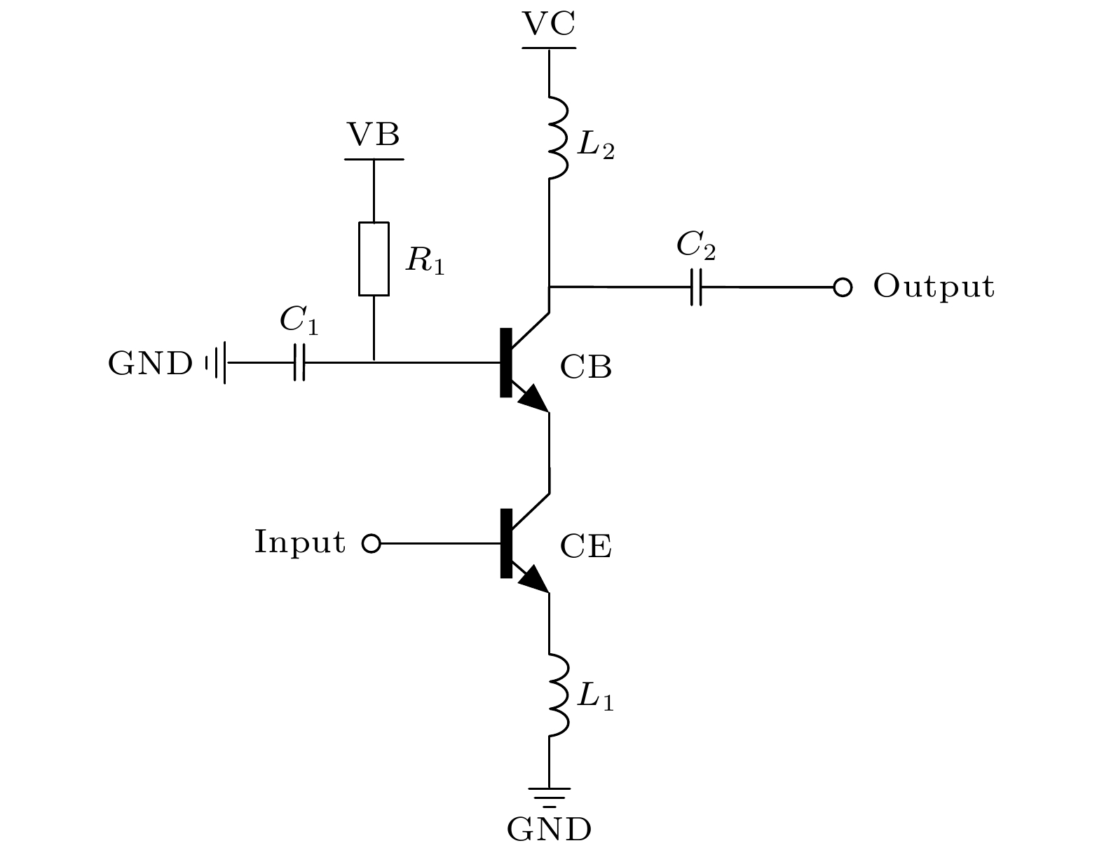 • LNA的电路图如图2所示, 使用Cascode结构可以提高增益和稳定性[17], Cascode结构电路由两个晶体管组成, 主要工作方式为共发射极(CE)晶体管的集电极端口将基极端口处施加的输入信号的电流放大, 该放大的集电极电流进入共基极(CB)晶体管的发射极, 在集电极处被单位增益放大[18]. 图2中L1为发射极反馈电感, 可以消除输入阻抗实部, 并且抵消掉一部分容性阻抗; L2和C2在输出端口组成了L型的输出阻抗结构, C2起到隔离直流并且匹配实部阻抗的作用; R1串联分压, 搭载C1作为去耦合电容; CB, CE为前文中搭建的SiGe HBT, 保证电路的稳定工作.