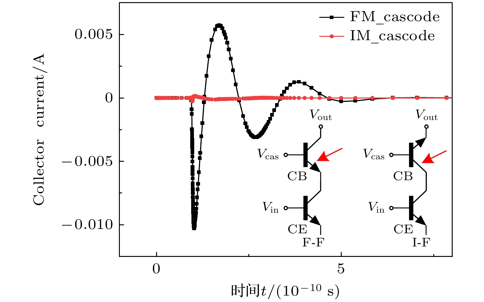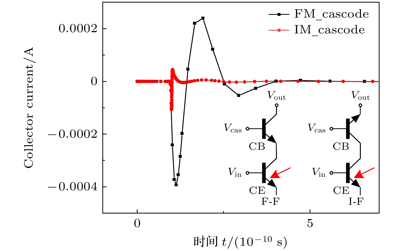 入射CE晶体管时, I-F模式的电路的瞬态电流较F-F模式减小66%; 电流持续时间明显地缩短; 由于在入射CE晶体管情况下, 当CB晶体管为FM模式时, 大部分注入的载流子会正常通过其发射极流过集电极, 而CB晶体管处于IM模式较于FM模式, 由CE晶体管产生的大部分过剩电子-空穴对会舍弃发射极进入CB晶体管的衬底-集电极, 这有助于降低CE晶体管集电极处输出SET的瞬态峰值. 因此, 采用IM结构会降低SET瞬态峰值和电流持续时间, 理论与实验结果相符.