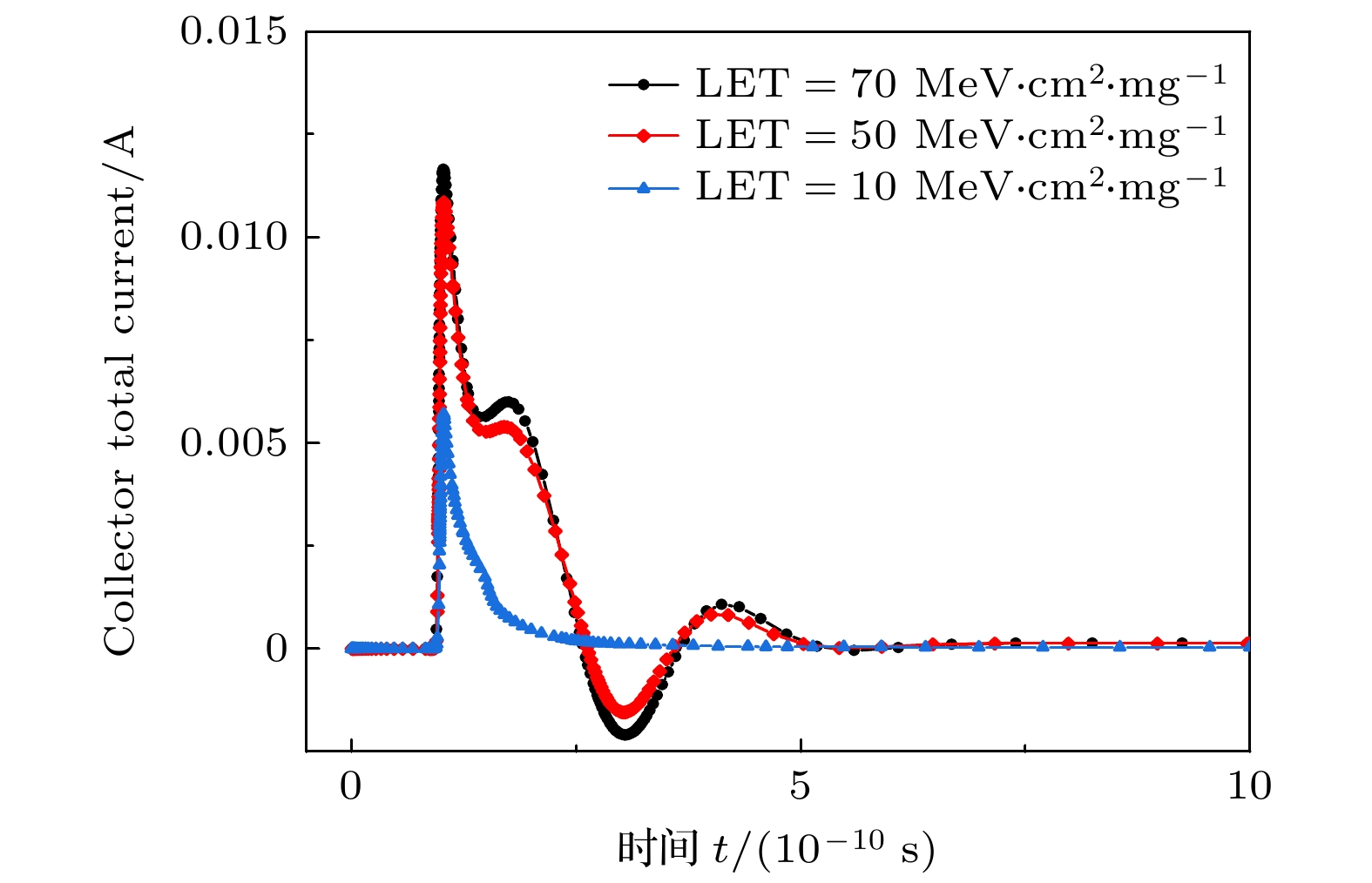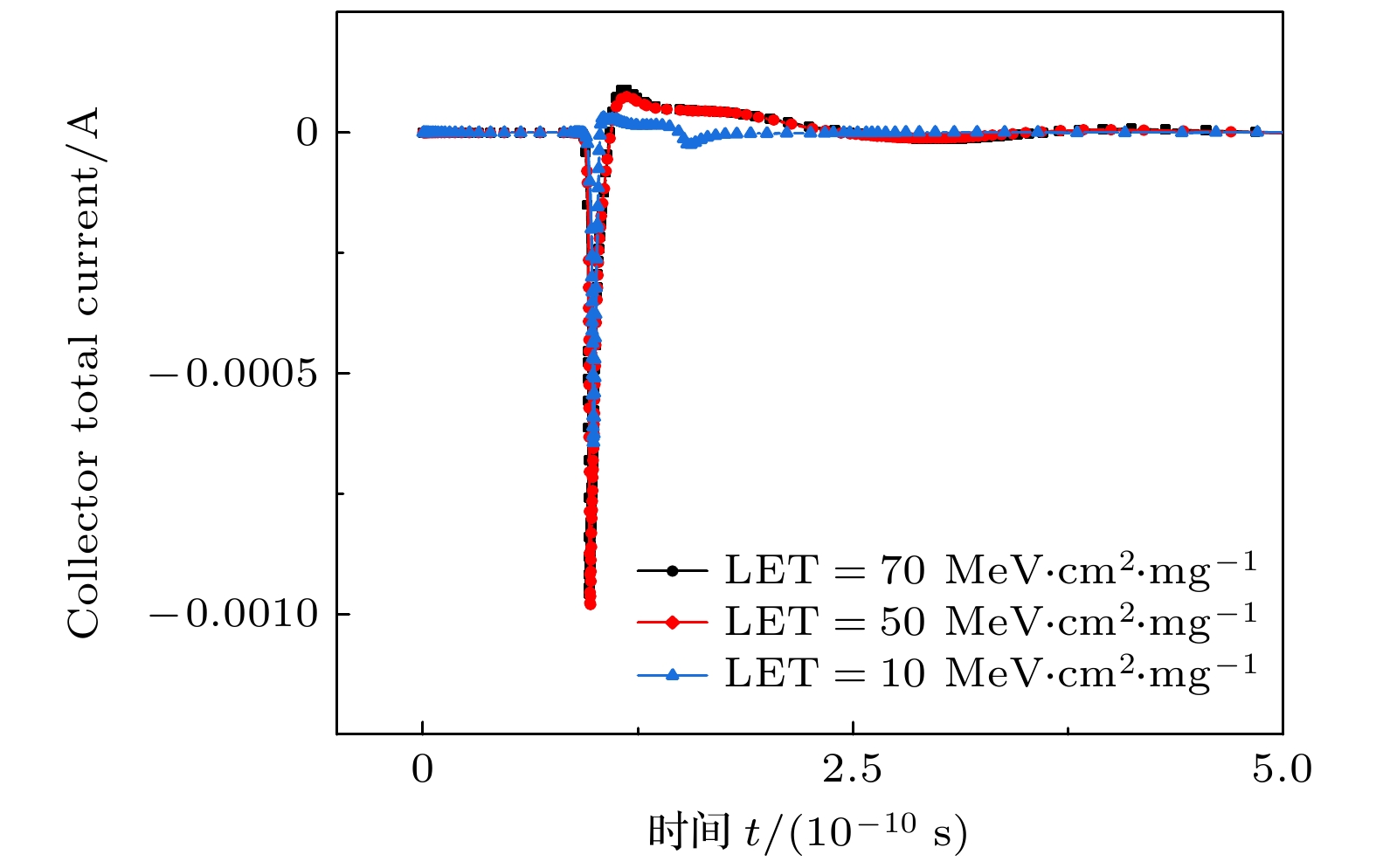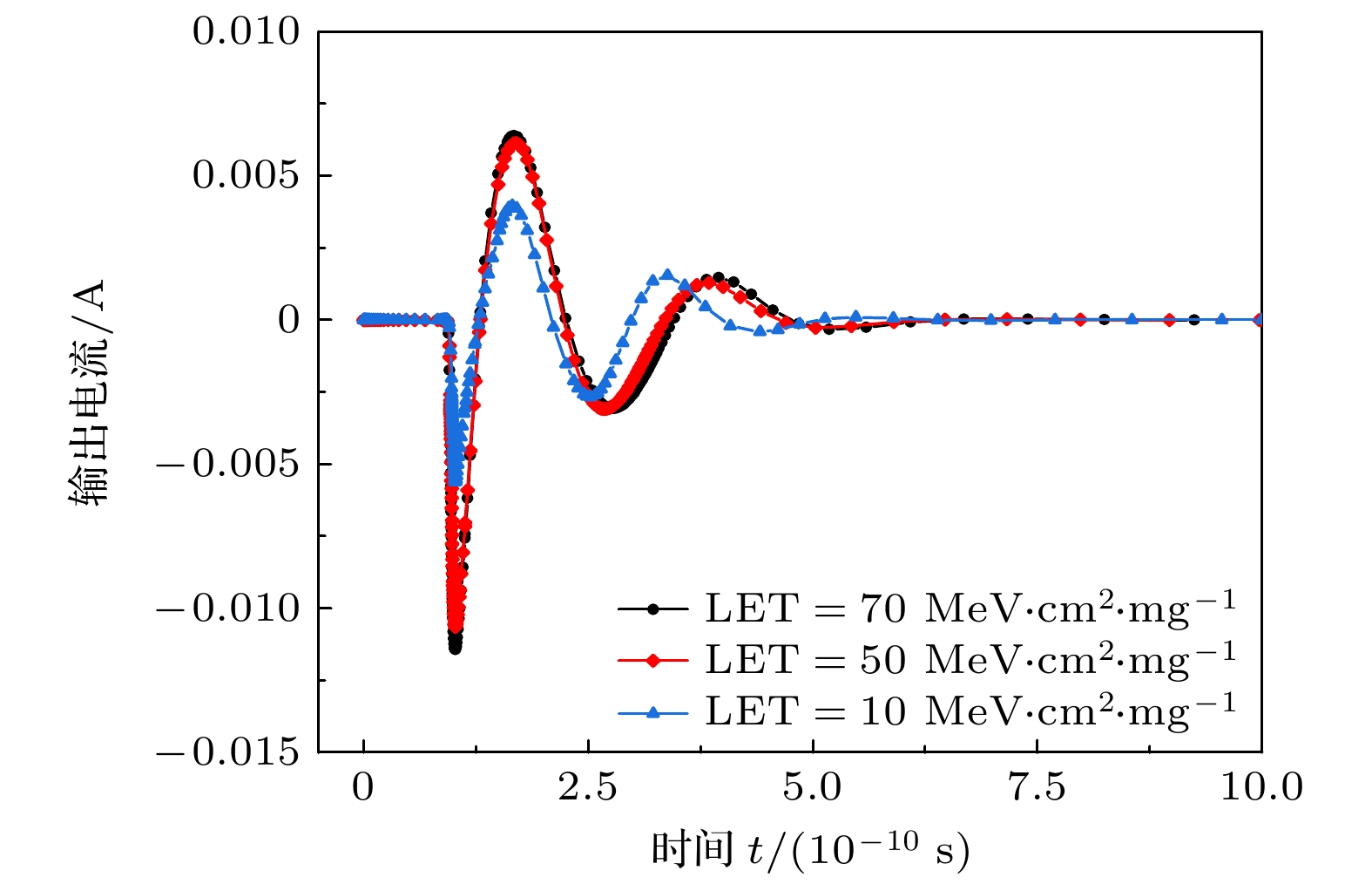 在入射离子的其他条件不变的情况下, 离子的LET值越大, 器件的单位长度上产生的电子-空穴对越多, 敏感区域内累计的电荷就越多, 产生的瞬态电流就越明显. 空间中太阳宇宙射线和银河宇宙射线包含的重离子原子序数分布在2—92, 地面试验模拟中常采用LET值为1—98 MeV·cm2·mg–1的离子进行辐照评估, 仿真选取LET = 10, 50, 70 MeV·cm2·mg–1作为变量进行仿真实验, 获得输出端口电流随不同LET值的变化情况.