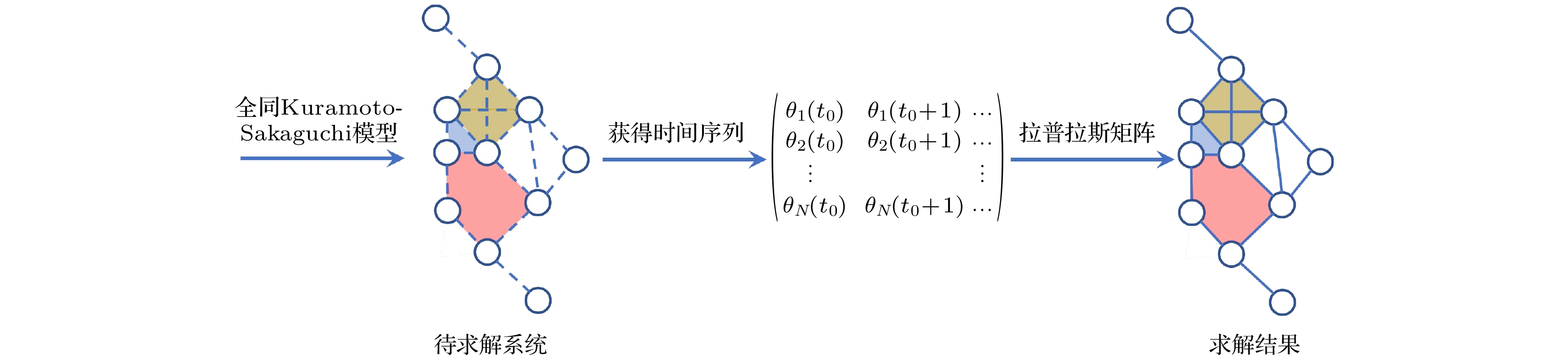 根据方程(35), 可以得出以下结论: 网络结构对称节点的相位在系统处于稳态后任意时刻均保持相同, 即任意的对称节点对ij, 满足$ {\textit{π}} = {\textit{π}} (j\to i) $置换对称时, 存在结论$ |\theta_i-\theta_j| = 0 $. 由(35)式可以得出网络节点的同步与节点在结构上的对称是充分必要条件. 由此, 本文提出网络重构方法, 主要包括以下4个步骤(如图2所示).