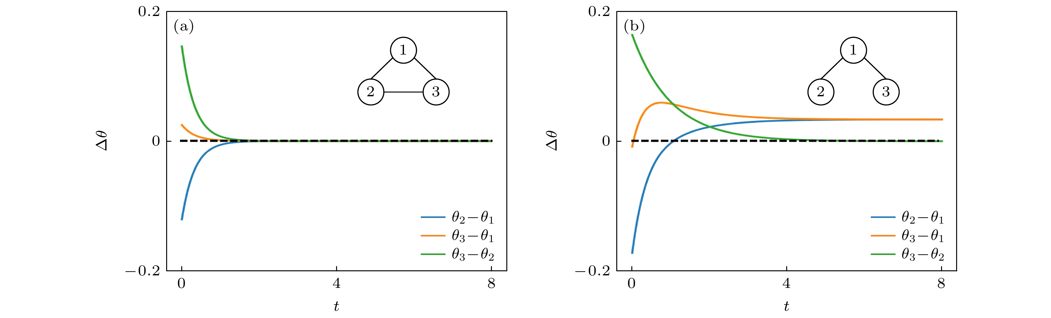 图3展示了两种$ N = 3 $的网络结构在$ \alpha = 0.1 $时每一对节点间的相位差时间序列. 将图3(a)图3(b)描述的系统稳定后任意时刻的节点相位(差)分别代入(42)式, 得到两个网络拉普拉斯矩阵为