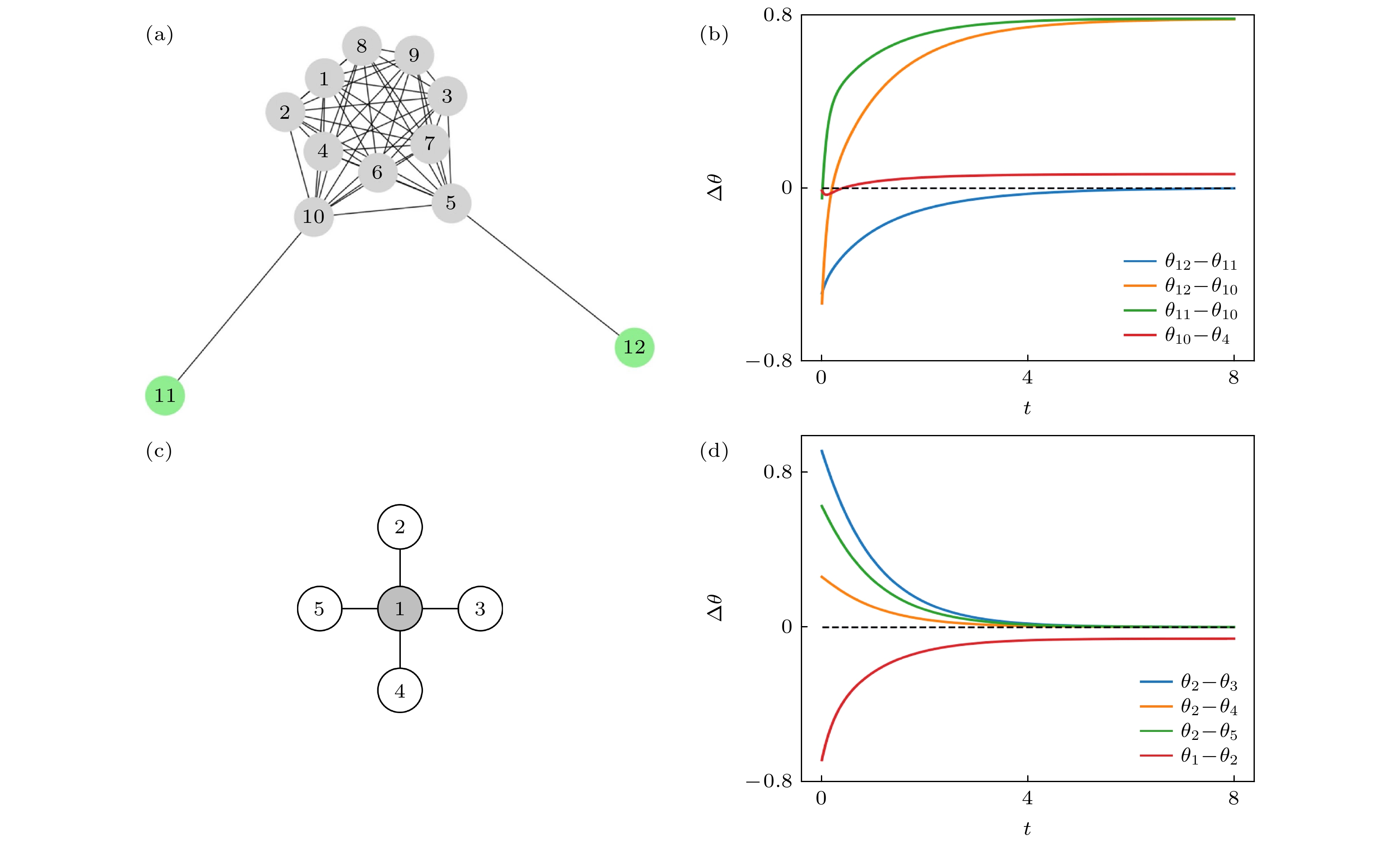 从网络结构的角度来看, 节点11和节点12之间没有直接连边, 而是通过中继全连网络间接相连. 此时它们之间产生的同步被称为遥同步现象, 这可以用更为简洁的结构图来说明. 比如, 图4(c)图4(d)展示了网络结构的对称性对于遥同步现 象的研究具有重要意义. 以图4(c)所示的$ N = 5 $的星形网络为例, 在特定的参数选取情况下, 4个叶子节点(度$ k_{{\rm{leaf}}} = 1 $的节点)将先于其各自与中间节点(度$ k_{{\rm{hub}}} = 4 $的节点)发生同步. 我们发现正是因为该模型满足叶子节点的交换对称性, 即$ {\textit{π}}\; (1, i = 2:5) $, 这里的$ i \in [2, 5] $可以随意置换. 这与数值模拟的结果相符合(如图4(d)所示), 各叶子节点的相位差均为0, 而叶子节点与中心节点存在一个恒定且相同的相位差. 进一步通过上述方法所识别的网络拉普拉斯矩阵见附录A.