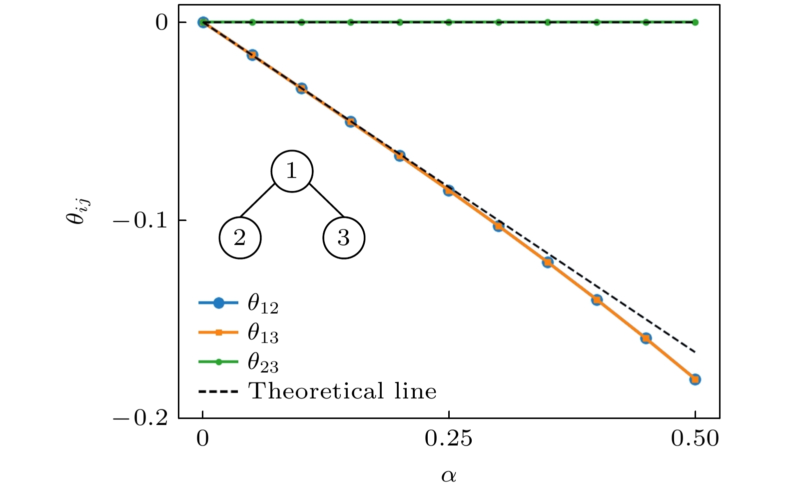 例3 本文在KS节点同步流形的附近, 采用线性近似的方法找到了同步与网络结构的关联性, 特别强调了相位延迟项α在网络识别中的重要作用. 以三个节点组成的链式网络为例, 说明线性近似的方法在较大范围内都是可行的, 结果如图5所示, 展示了各对节点相位差随着α的变化情况. 其中黑色虚线为根据方程(31)计算的理论解, 结果显示, 对称节点2和3之间相位差为$ \theta_{23} = 0 $(水平黑色虚线), 且与α的取值无关, 绿色的点线为数值模拟结果. 而对于非对称节点$ \theta_{12} = \theta_{13} = - {\alpha}/{3} $(倾斜黑色虚线是方程(31)的理论解), 分别与蓝色和橙黄色点线的数值模拟结果对应. 进一步可以发现对于任意的α, 对称节点的数值解和理论解均完全符合, 而对于非对称节点, 仅当α较小时数值解和理论解才较为相符.